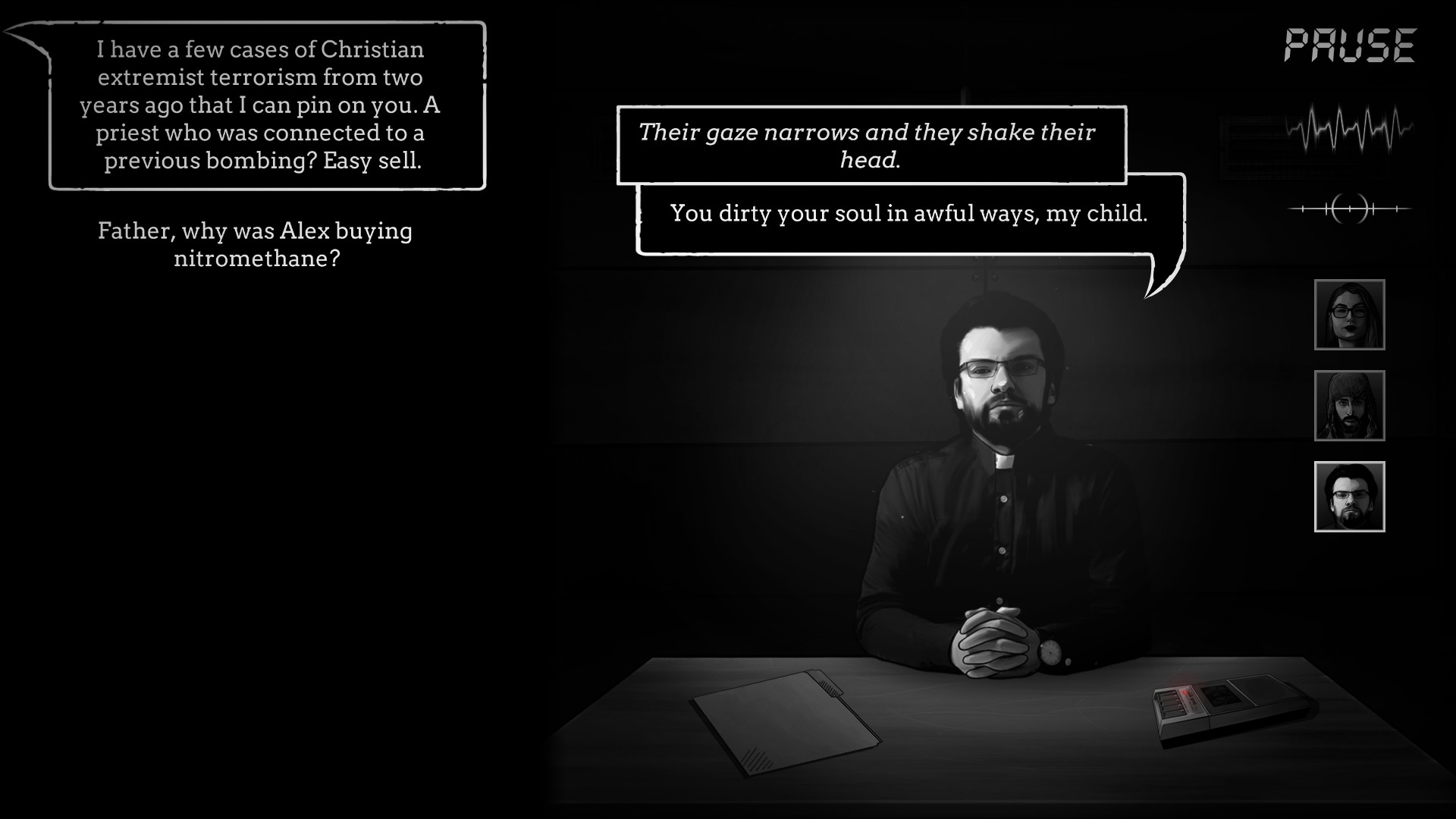 As a detective tasked with bringing down a dangerous terrorist group, you fight on two fronts: interrogating suspects & managing your team and its reputation. With time running out, how far will you go to stop these criminals? Manipulation, threats or even torture? Does the end justify the means?