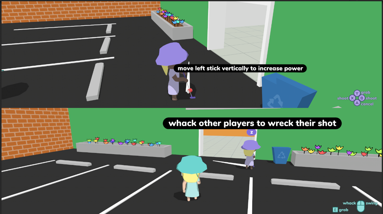Gone is the silly blue rules sign. Now there are interactive prompts that appear in the world to show new players the ropes. The tutorial will guide you through finishing your first hole, as well as help in other ways like when to whack other golfers.