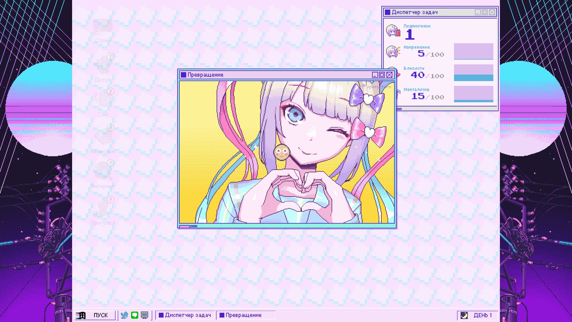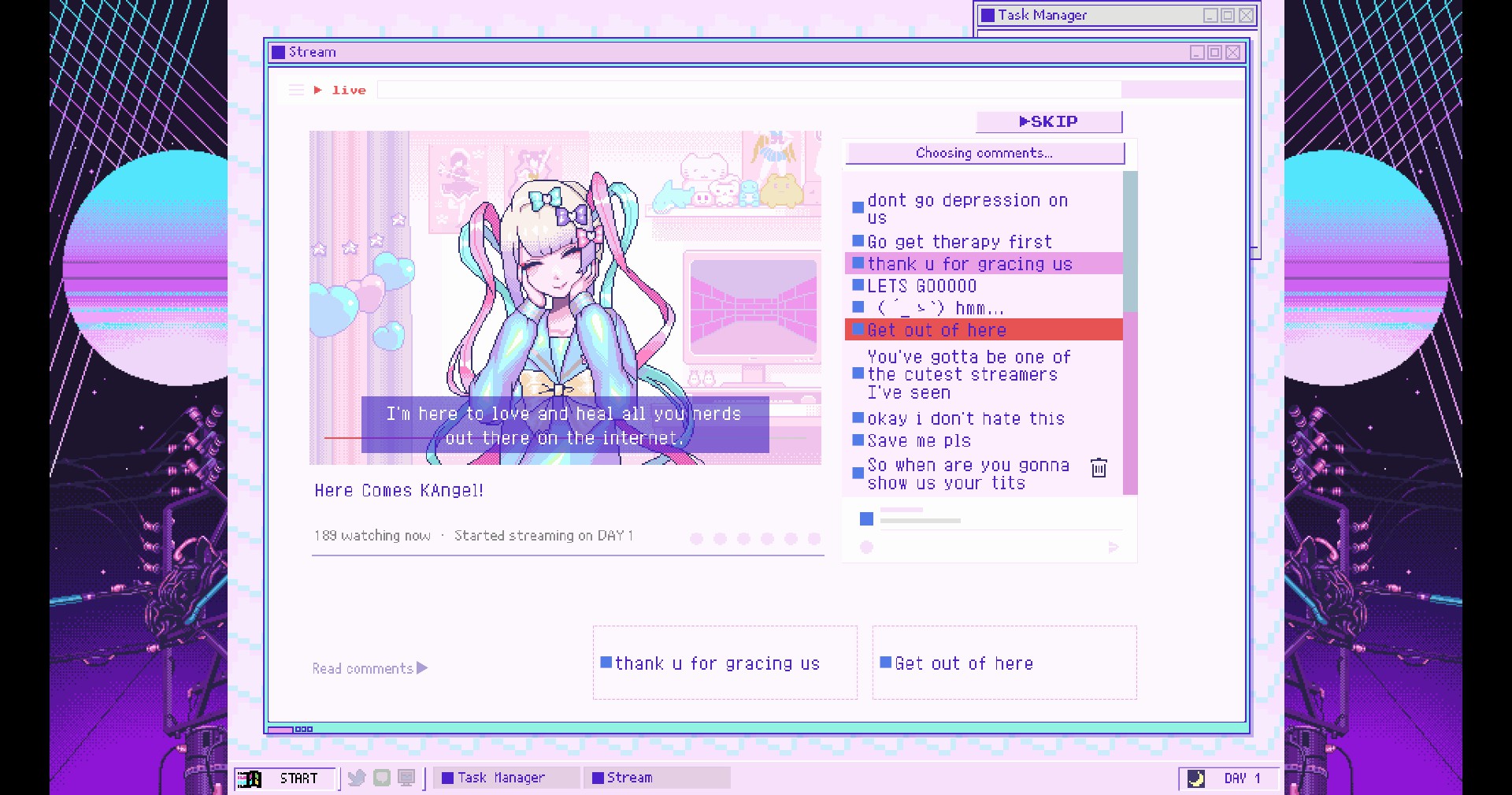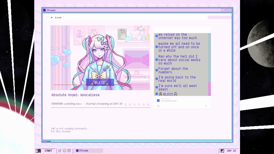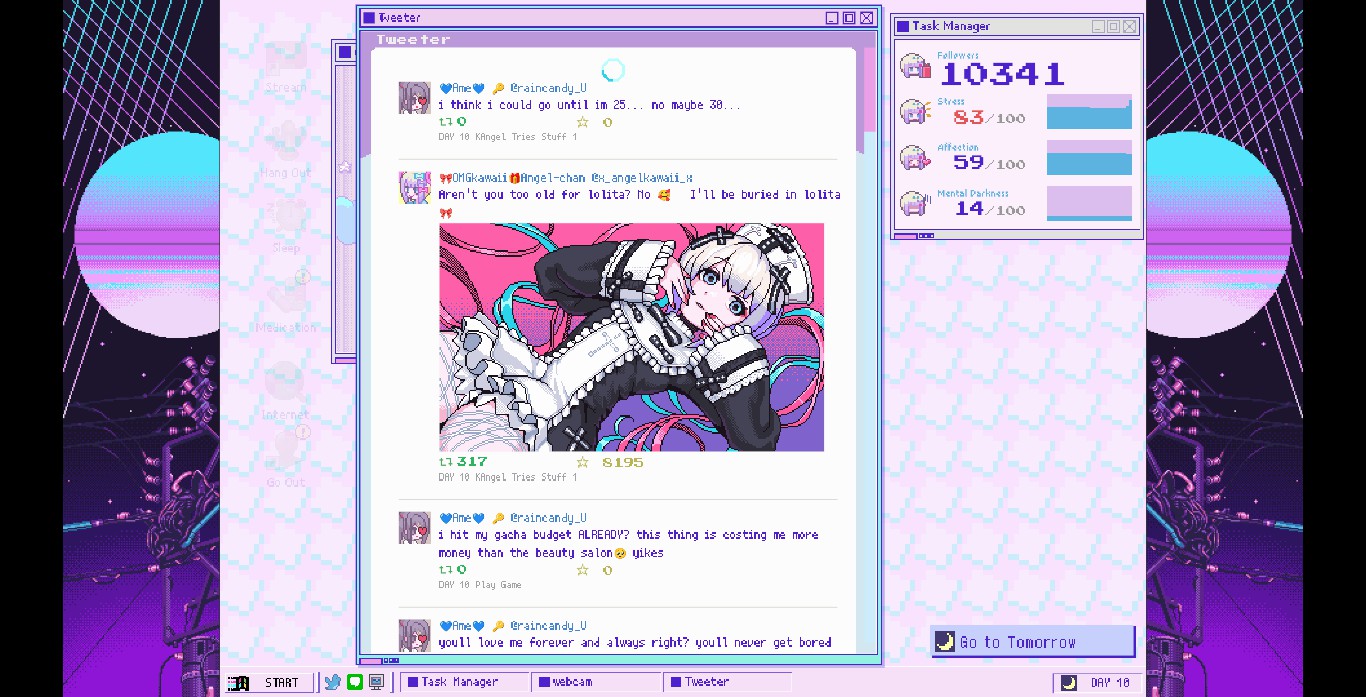 NEEDY STREAMER OVERLOAD is a “multi-ending ADV” depicting daily life with “OMGkawaiiAngel”, a young girl with a rather extreme need for approval attempting to become the #1 “Internet Angel” (streamer).