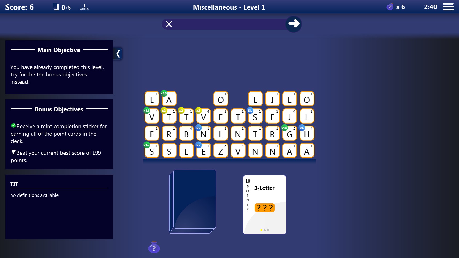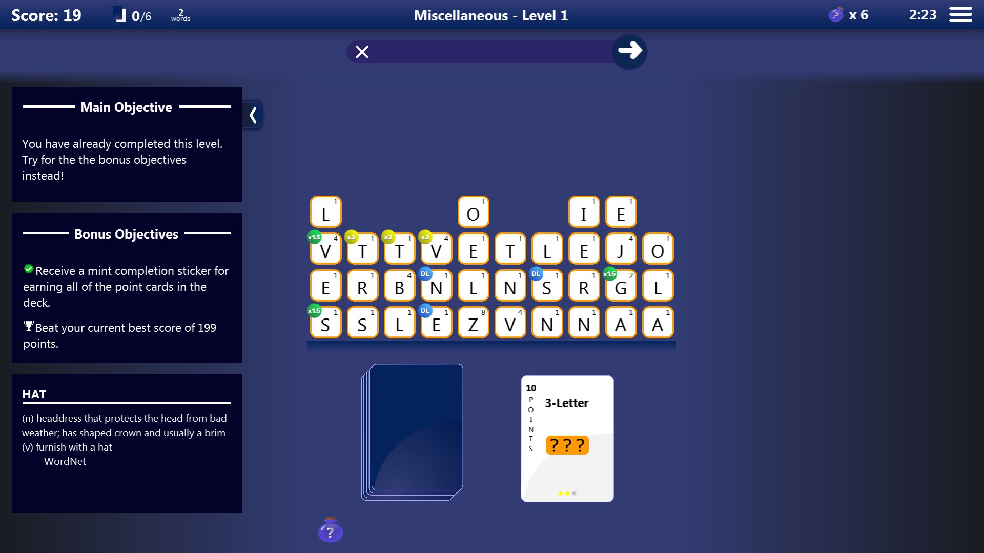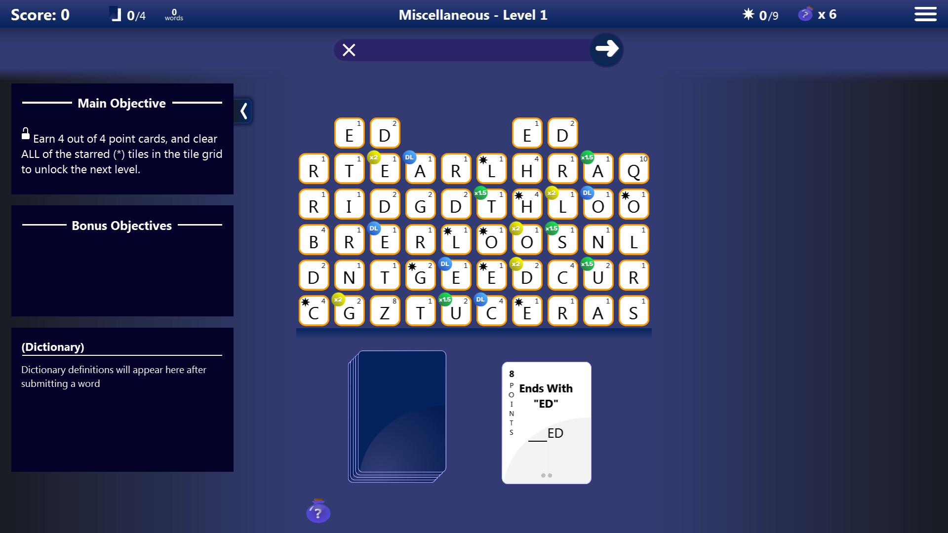 Shuzzler is a category-based word trivia game with cards drawn from a deck as the central mechanic. Cards determine criteria for word submissions and must be earned by spelling words meeting their criteria. Gem tiles, lock and key tiles, and action cards allow for varied gameplay and replayability.