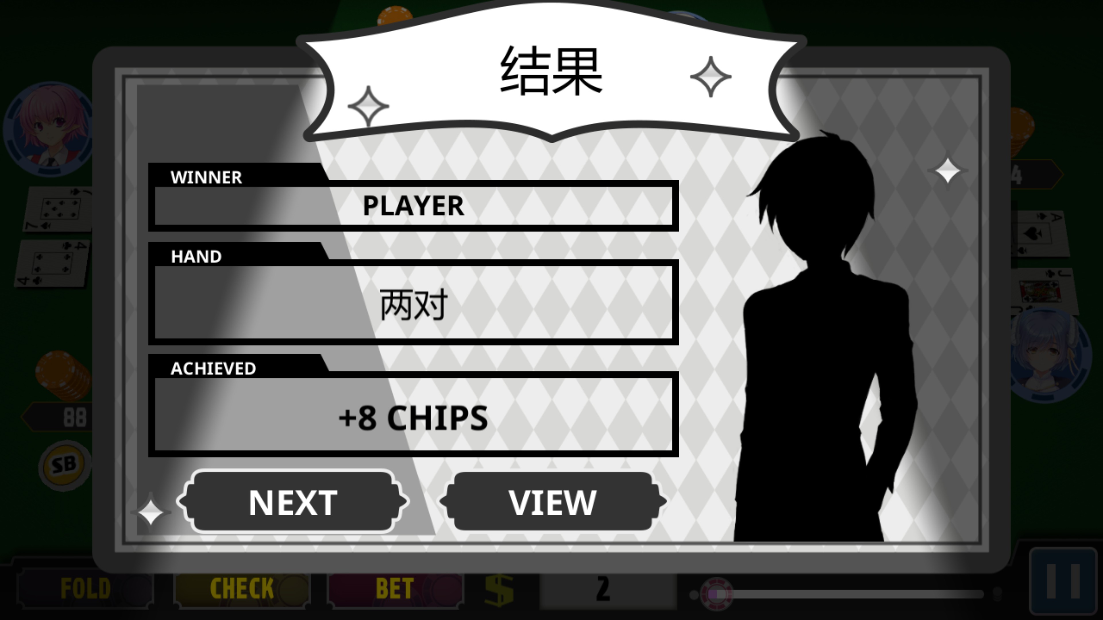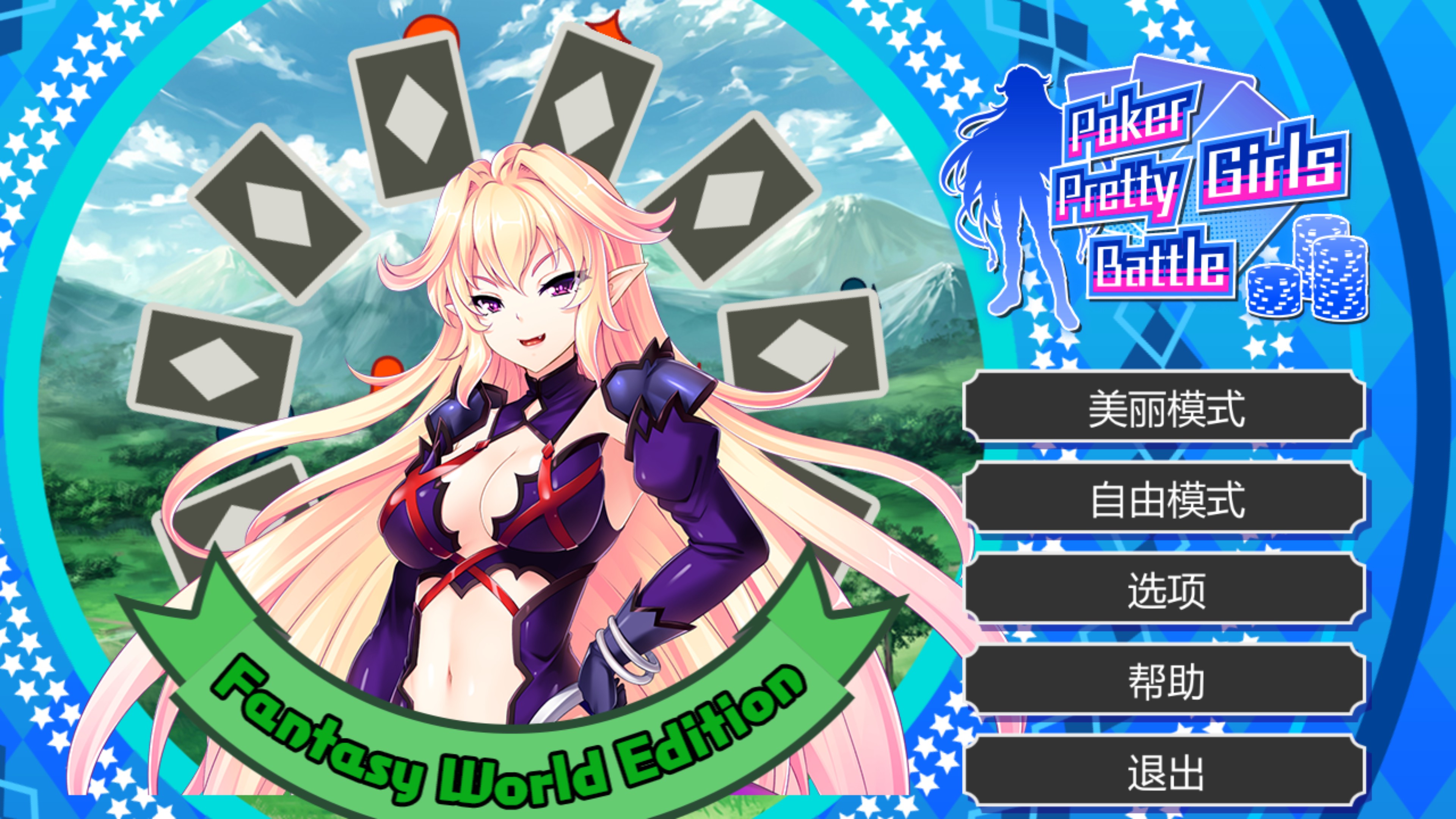 Come play some hot rounds of poker at the Fantasy World casino! Try your luck against a total of 16 Pretty Girls including elves, magical girls, female swordsmen, and demons who are awaiting your arrival! Featuring popular Texas Hold'em rules.