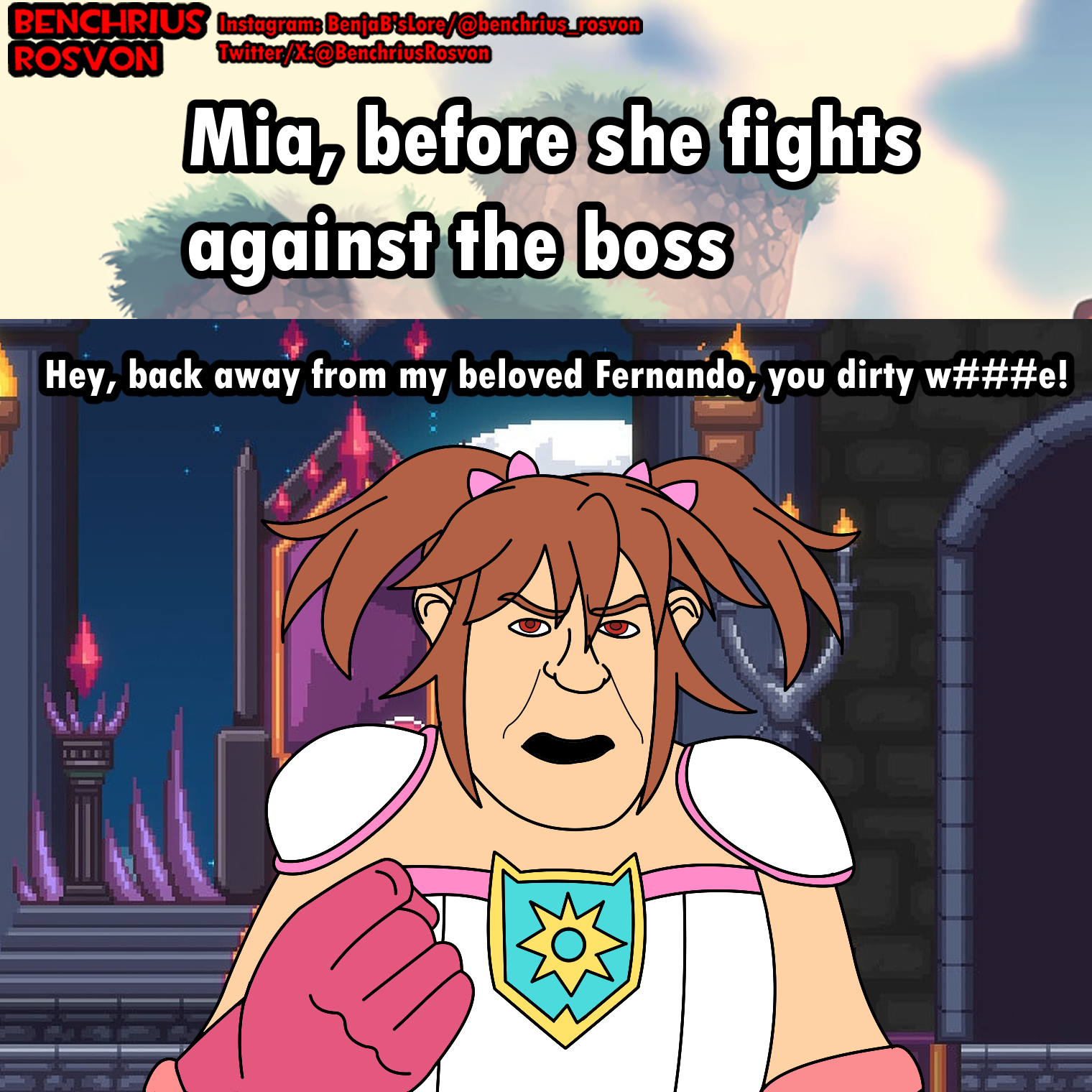 A retro platform, side-scrolling game with gorgeous pixel art. Help Mia rescue Fernando, her husband, who has been kidnapped by a Dark Elf named Morganna and her pack of Monster Girls.