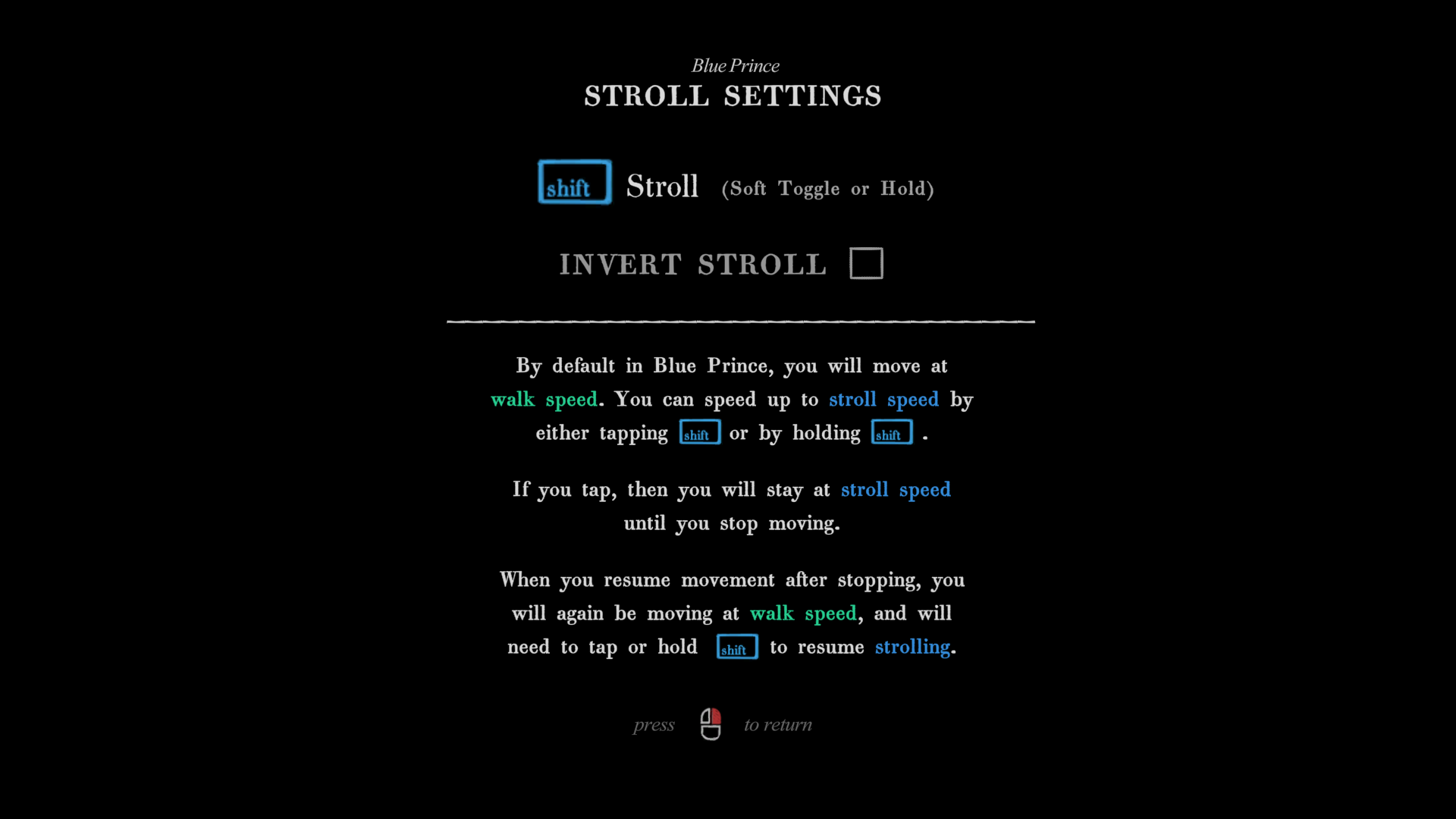Invert Stroll - This is a feature that will allow players to invert the stroll button functionality. Inverting this means you will move at the faster stroll speed without needing to press/hold a button, and pressing/holding the stroll button will slow you down to a walk.
