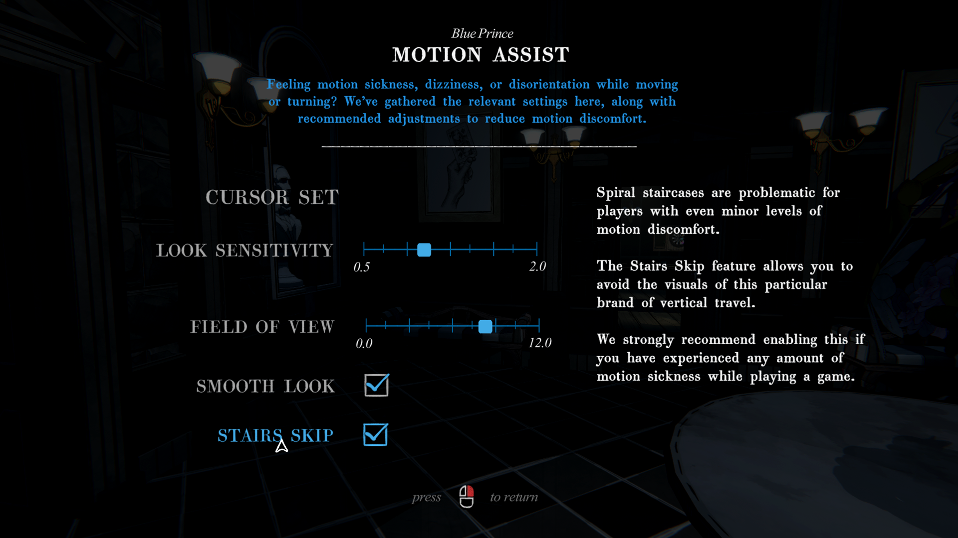 Motion Assist - A consolidated menu of features and settings aimed to reduce motion sickness and sensory conflict: Cursor/Reticle Settings, Look Sensitivity, Field of View, Smooth Look, and Stairs Skip (visually turn off spiral staircase travel.) Each feature is included along with our recommended setting adjustments.