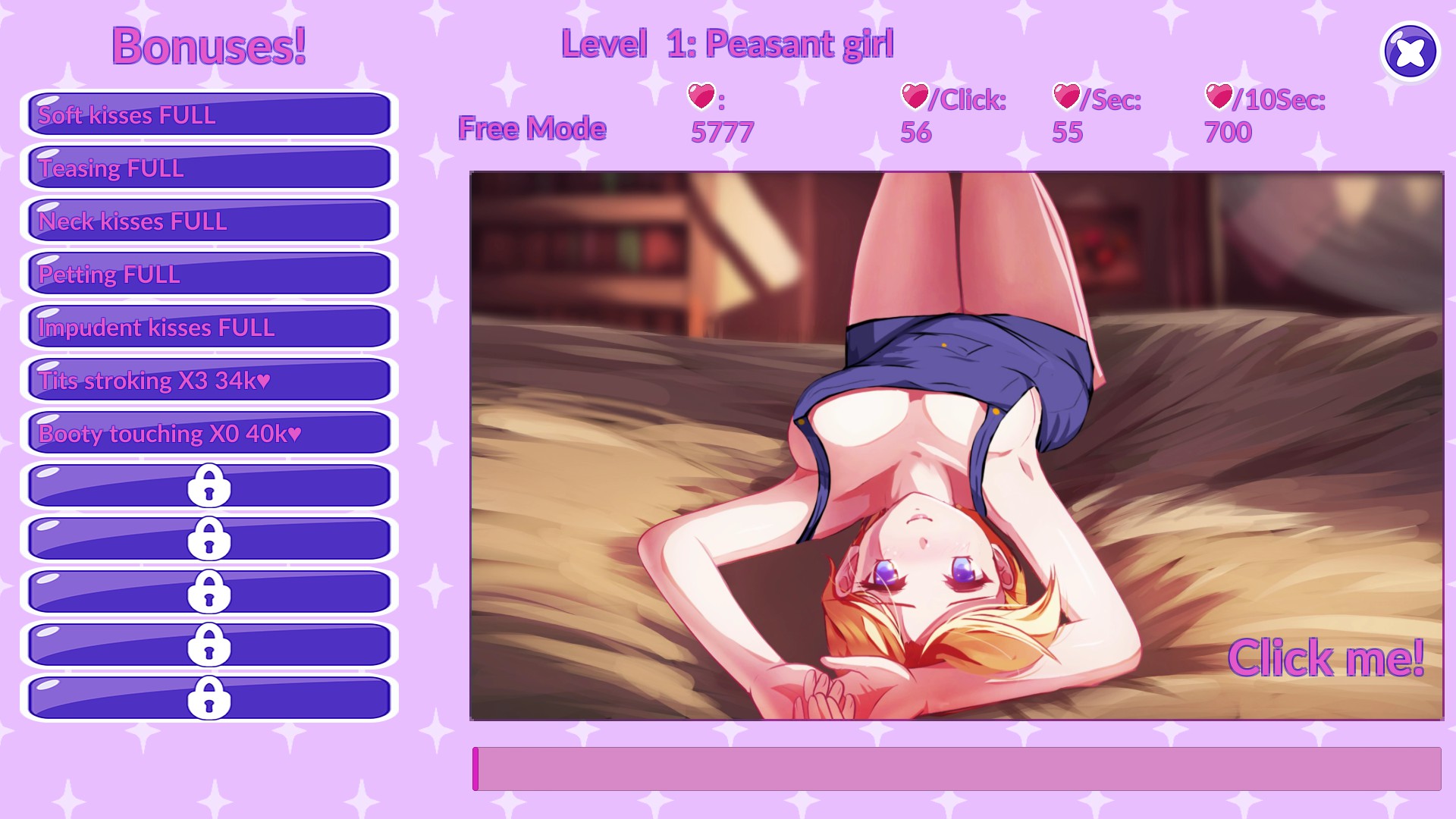 The fun and sexy video game: get the love of the hentai girls through thorough clicks! Get they enjoynment in the form of new poses and reactions. If you get too excited over some of the girls - you can stop at her and replay it. Don't forget to get the tons of achivements! Play now!