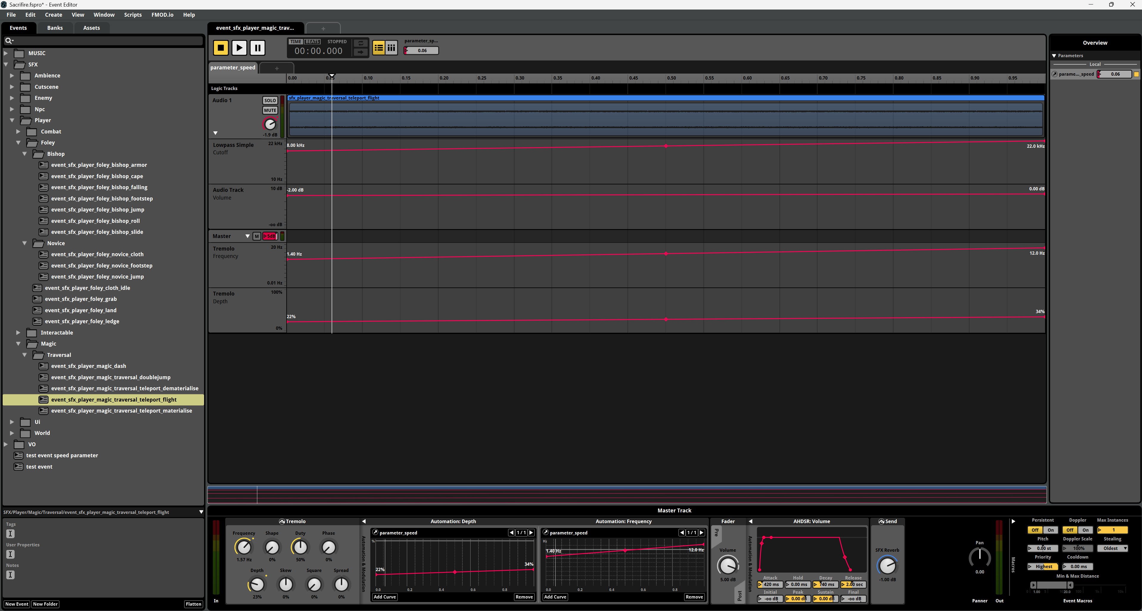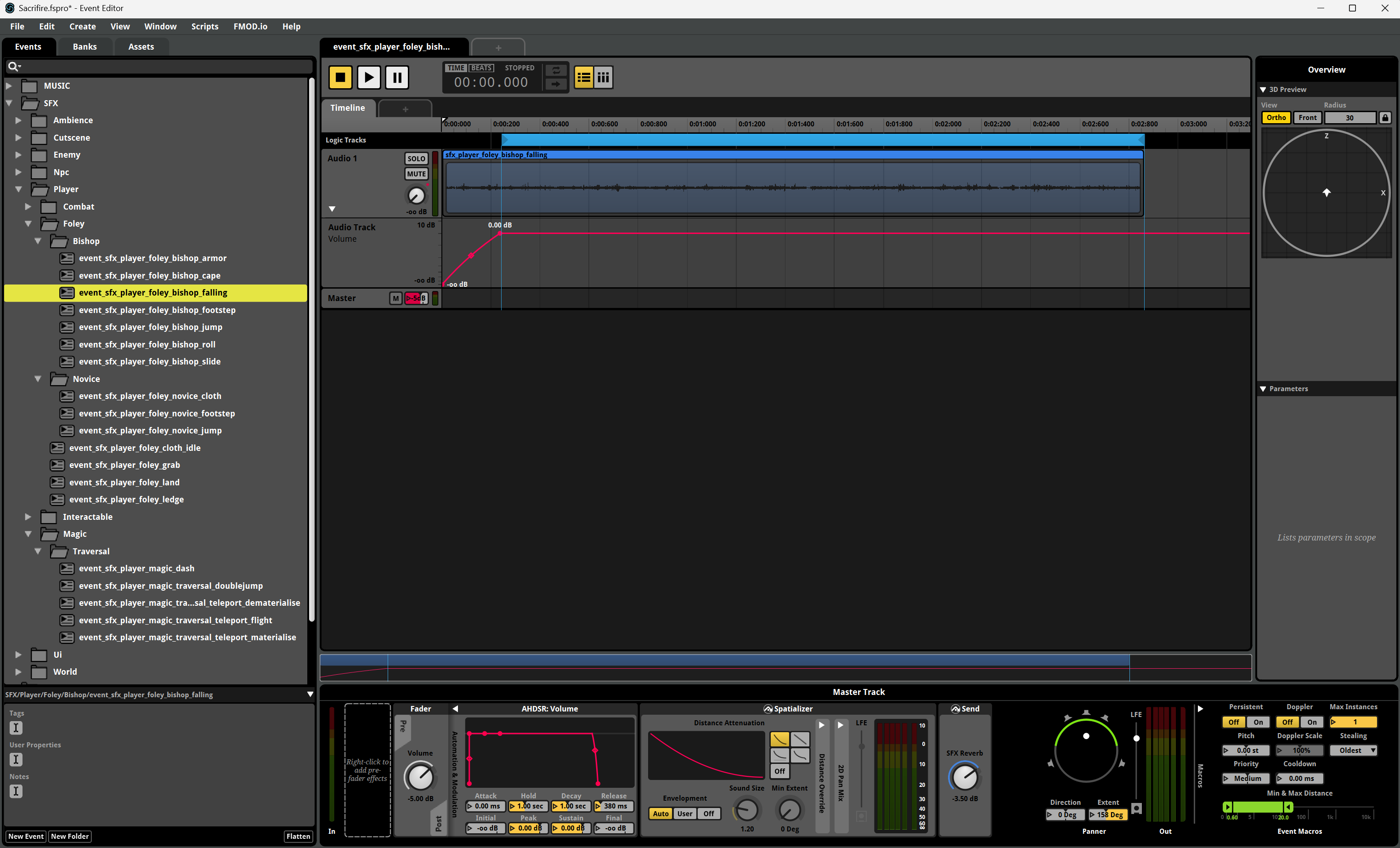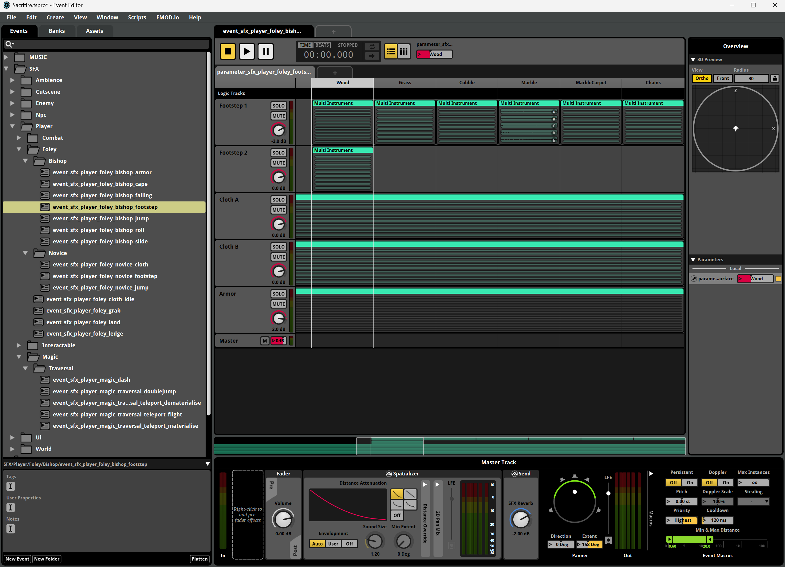 And for that you definitely need good foley, meaning sound effects synchronized to the movement of a character, such as footsteps, cloth and armor, grabs, and so on. Right now, for Ezekiel there are sounds for his armor, cape, footsteps (6 different surfaces), jump, double jump, falling, land, dash, roll, slide, grab and ledge grab. You could also add teleporting sounds but they are not exactly foley.