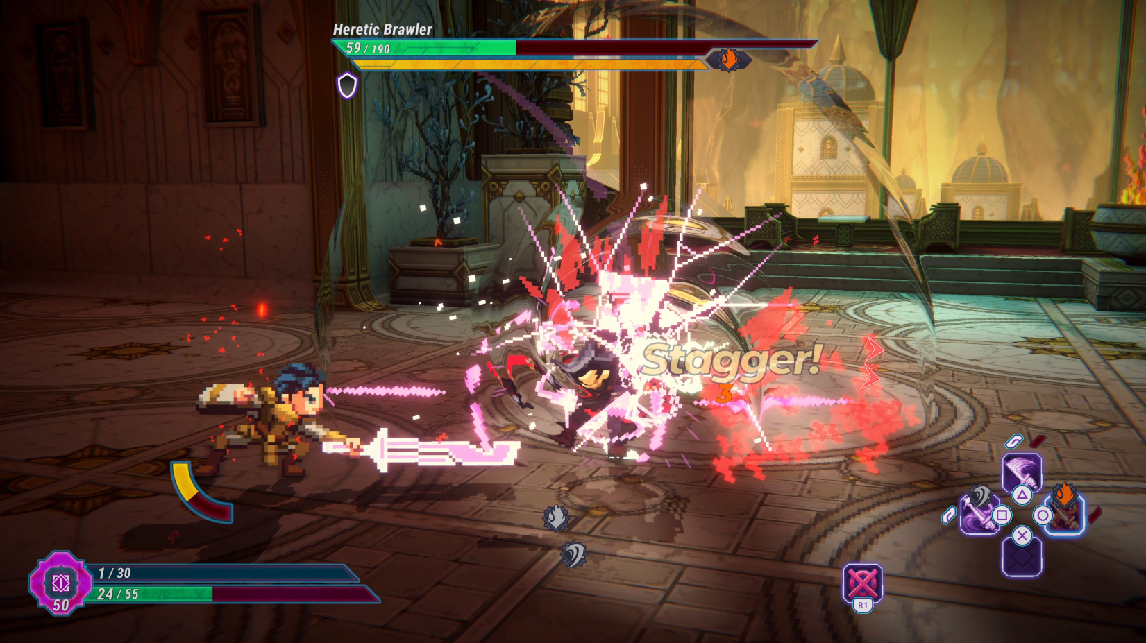 One of the goals of our combat system is to Stagger the enemy by filling their gauge and breaking them, dealing critical damage and stopping them in their tracks. When I first heard of this mechanic and saw it in gameplay, I immediately thought of Star Platinum’s iconic “The World” attack and it clearly inspired me in making the sound. At the same time, I also wanted to create some kind of a jingle to be played as soon as the game registers a Stagger hit, something akin to the Persona 5’s All-Out Attack.