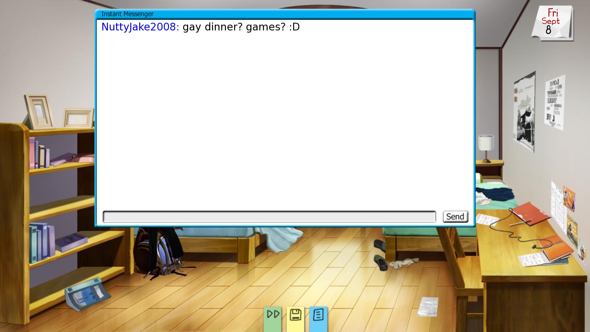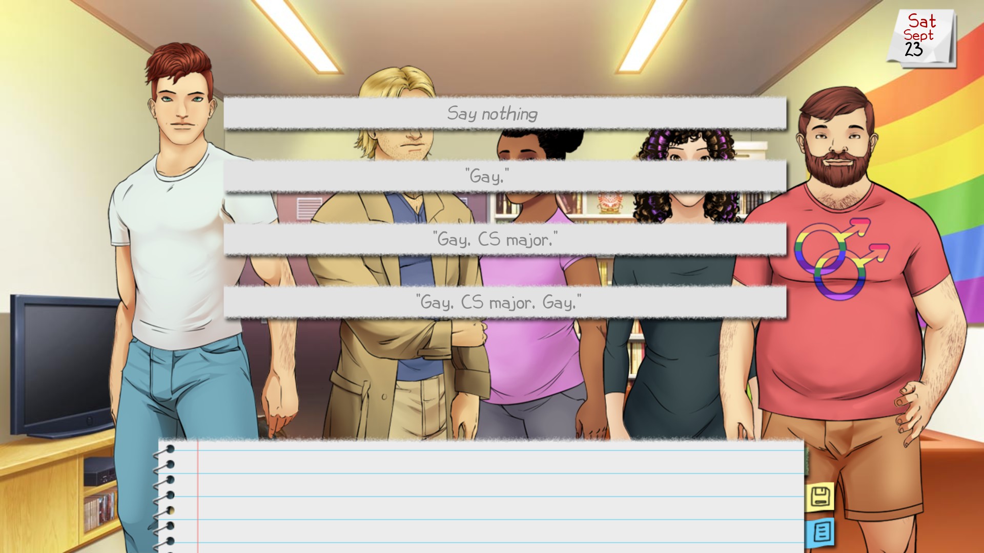 Yearning: A Gay Story (YAGS) is a realistic coming-out-focused character-driven slice-of-life visual novel where you play as a gay man starting his freshman year of college at a generic university somewhere in the midwestern United States.