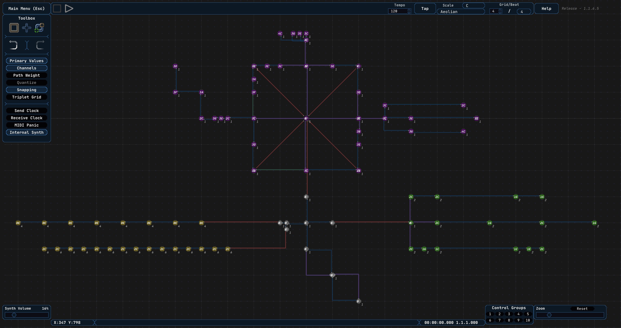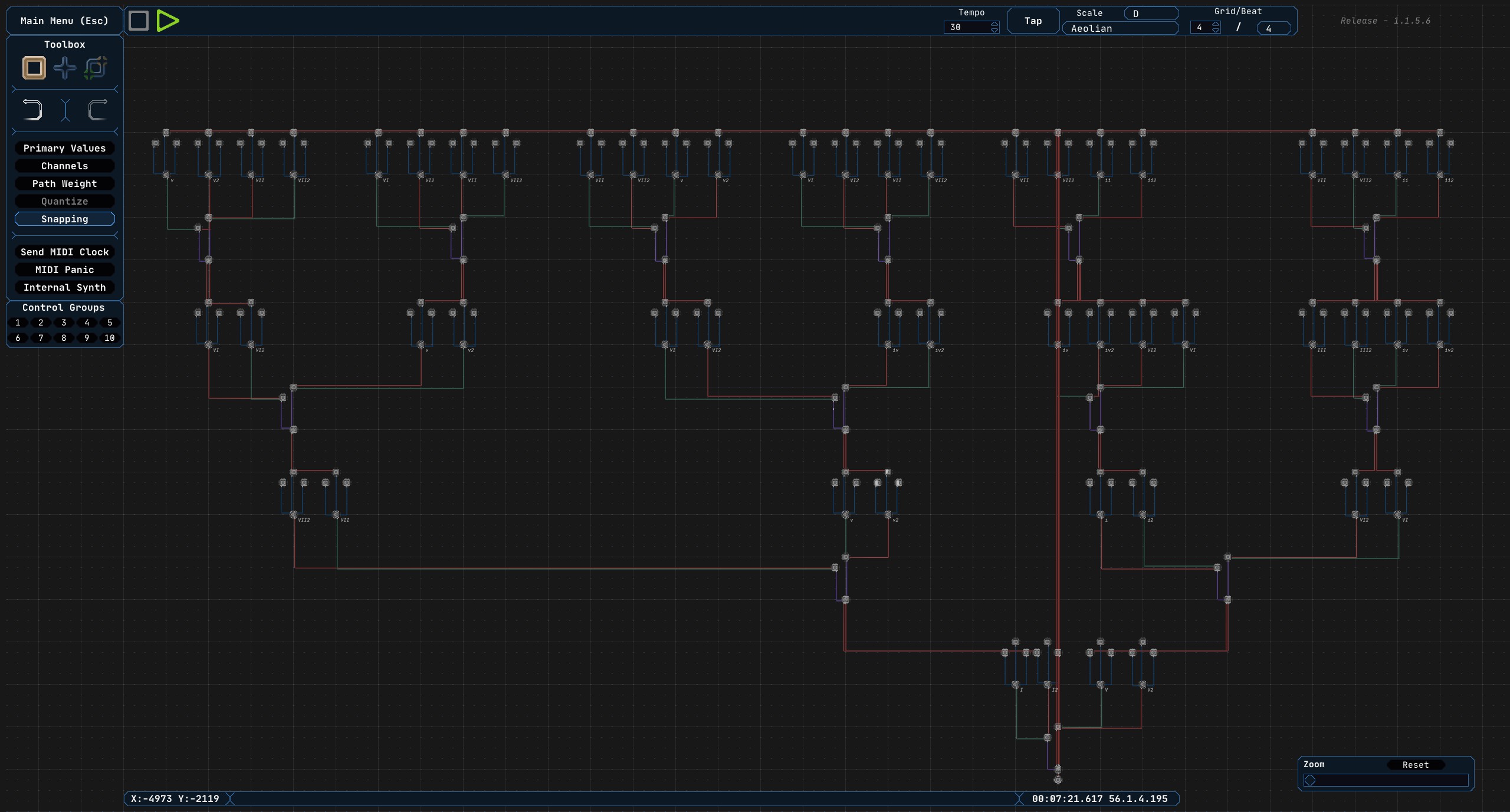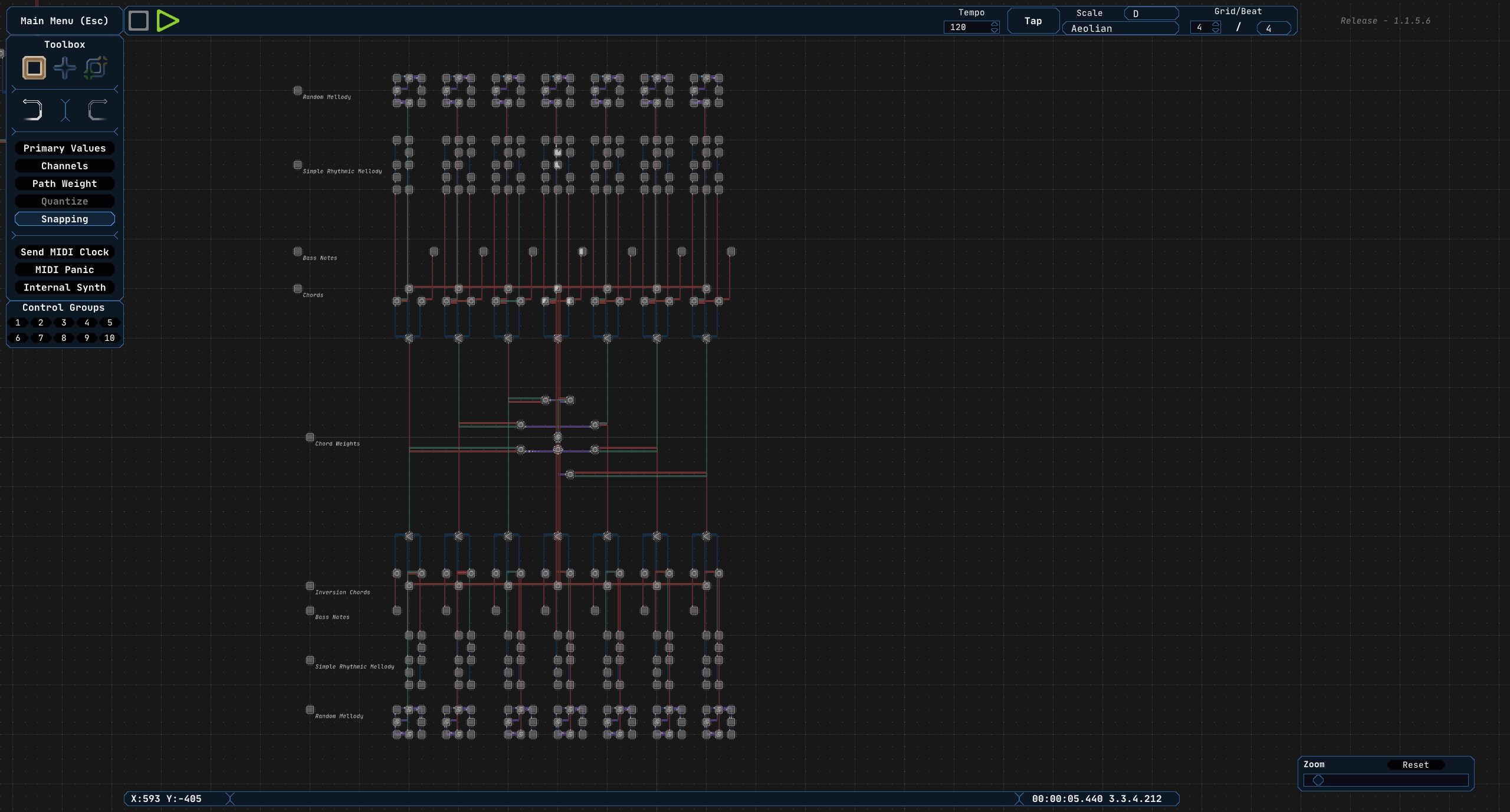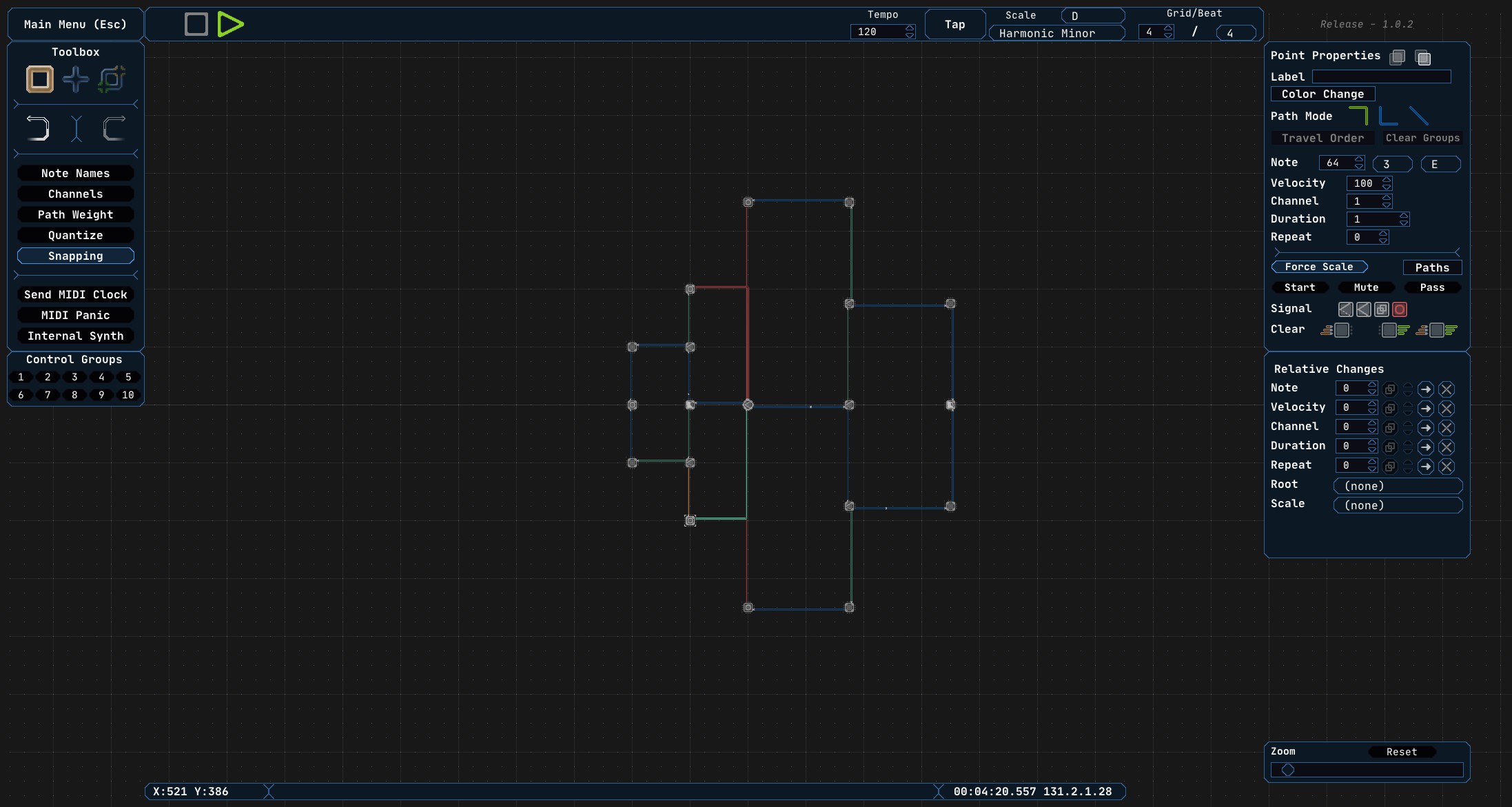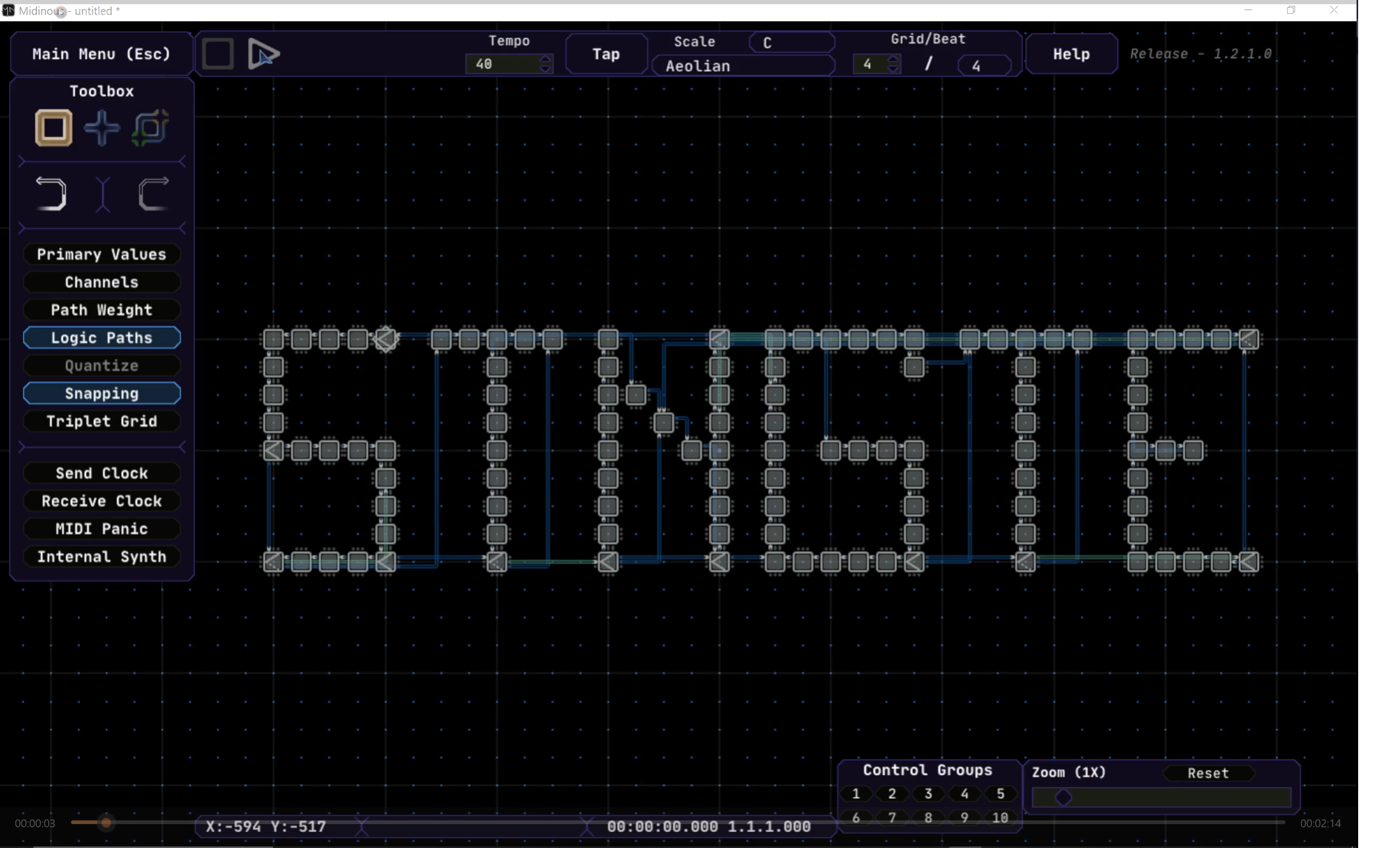 Midinous is a grid-based non-linear MIDI sequencer usable with any Digital Audio Workstation or hardware that accepts MIDI messages. Midinous can also generate its own simple sounds either for reference, or for normal use.