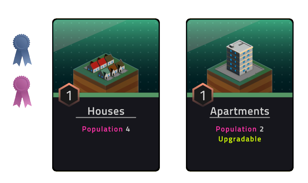 Attaching the blue trinket to the houses and the pink trinket to the apartments upgrades them with the trinket's attributes, resulting the in the following new cards.