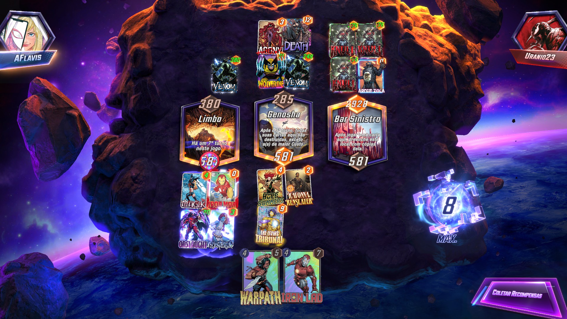 Objective: Have 3 cards that are 4-Cost or higher in play ➡️ Afflict the highest-Cost enemy card with -7 Power. (0/3)