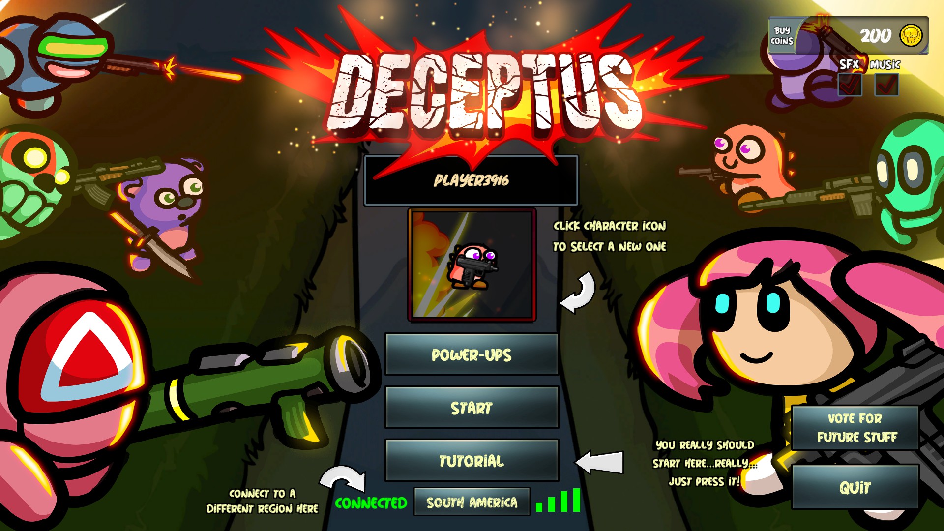 Arena PVP Multiplayer with up to 8 Players, pure mayhem, kill and collect famous death coins to unlock and equip up your characters with famous accessories and power-ups on 9 levels and counting.