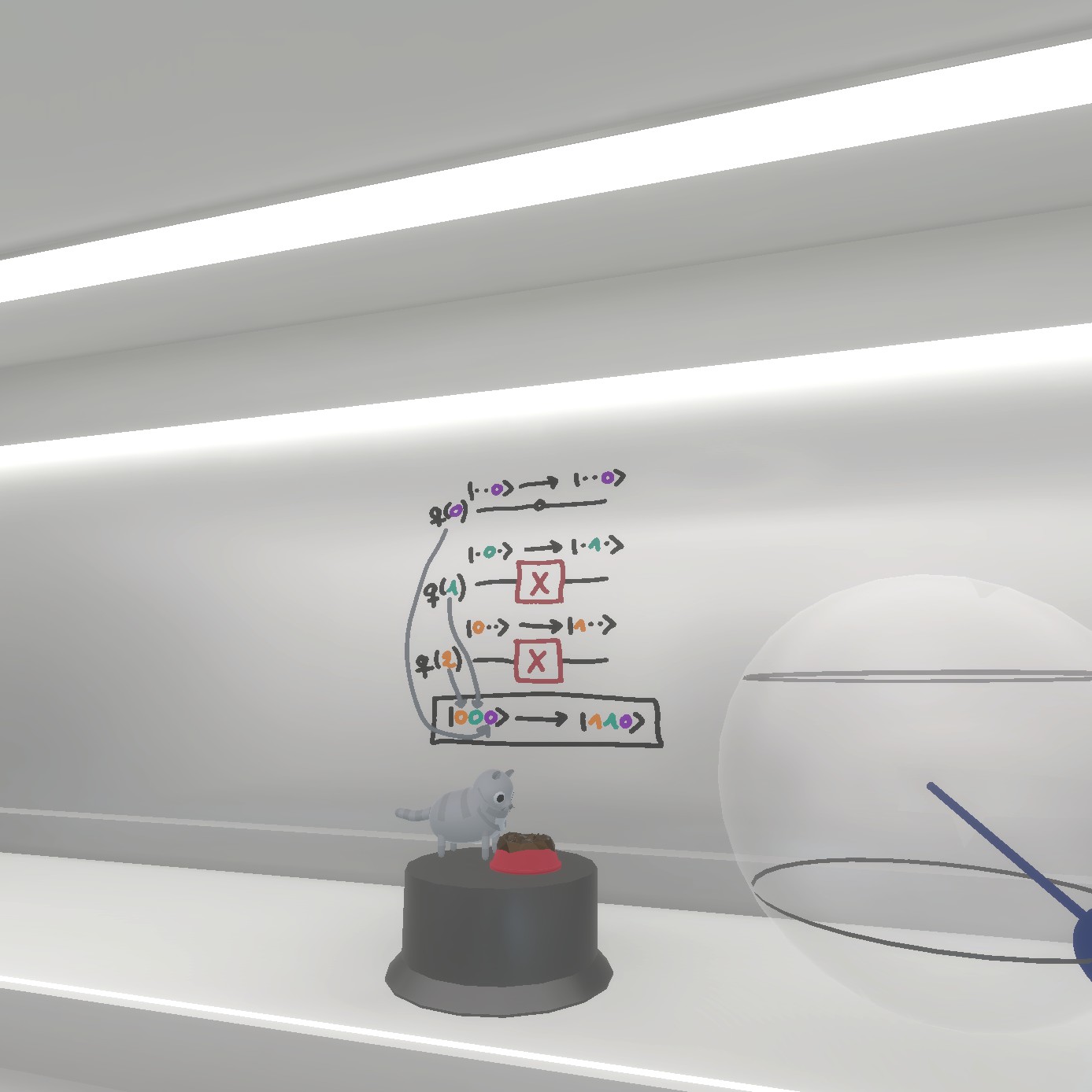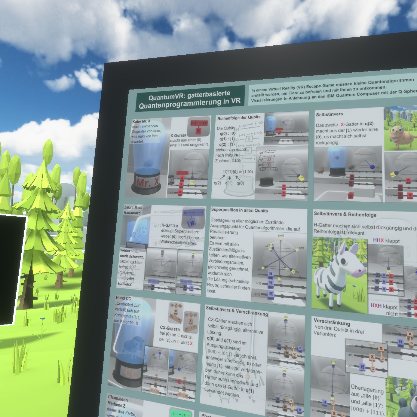 QuantumVR is a virtual reality game that teaches you to solve small quantum algorithms by placing simple quantum gates. In addition, a 2D version is available.