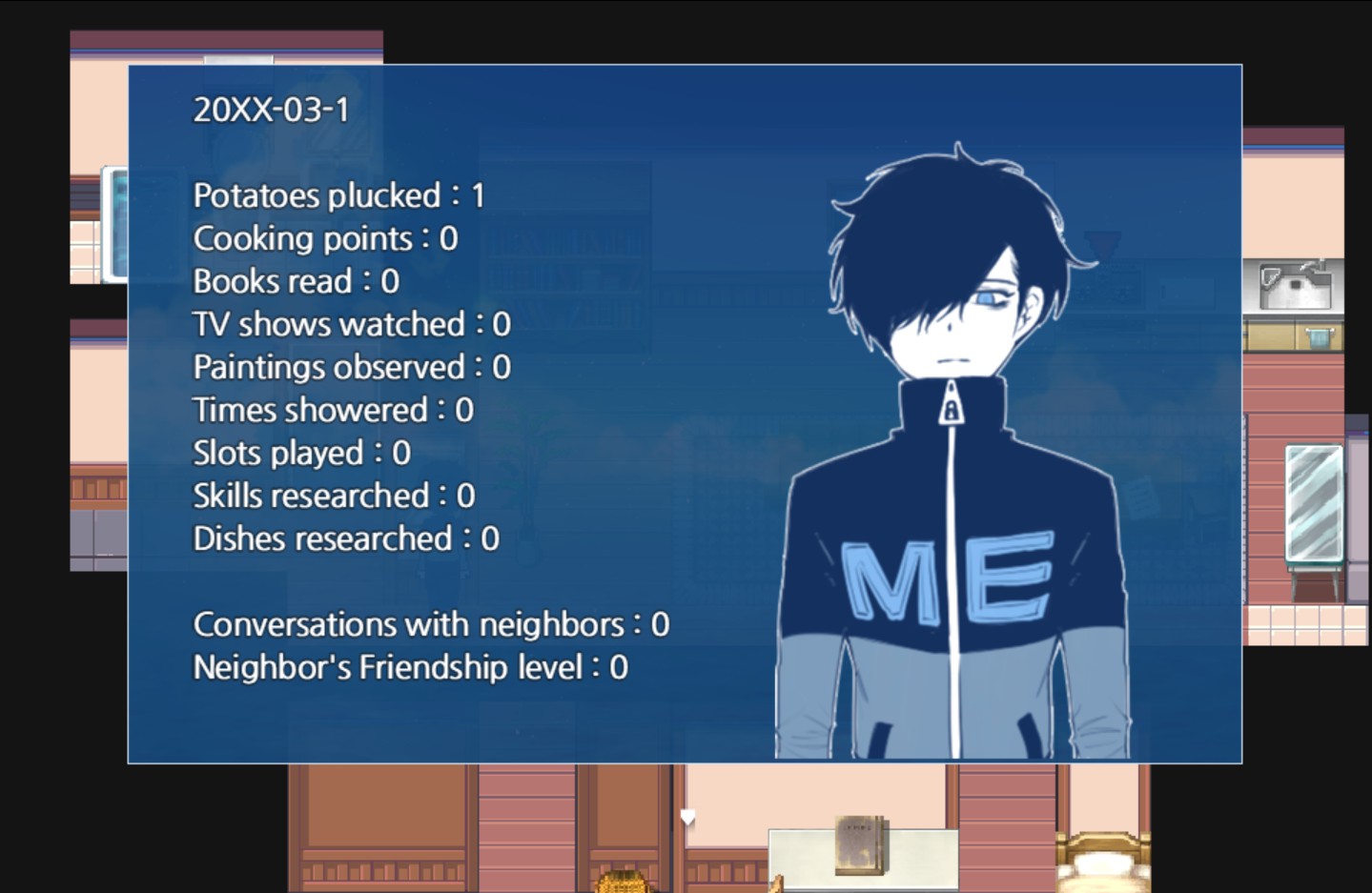 Potato Survival is a short story game about a character who lives alone on the open sea. Collect potatoes and try to survive for 21 days with the knowledge you gain daily. Unlock new skills to create a more meaningful day to day life!