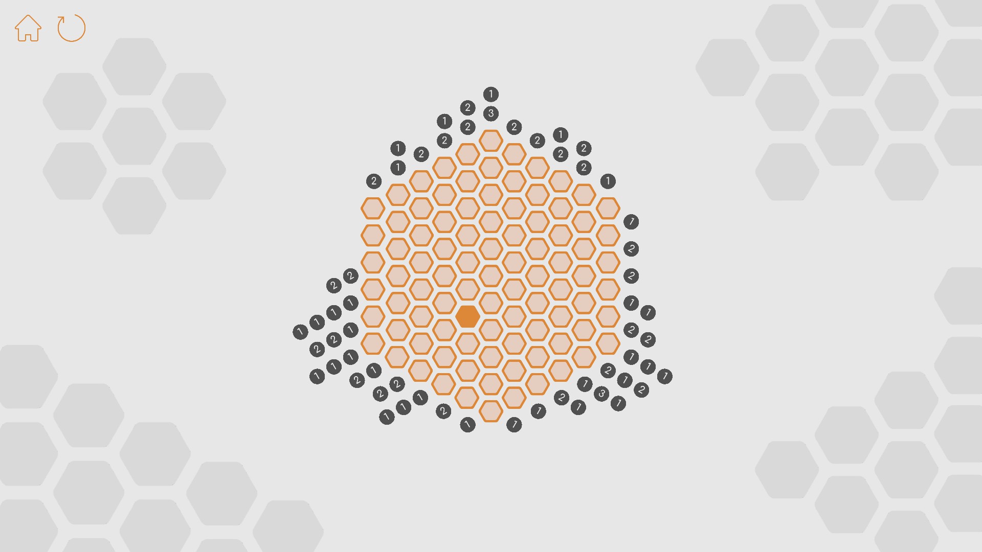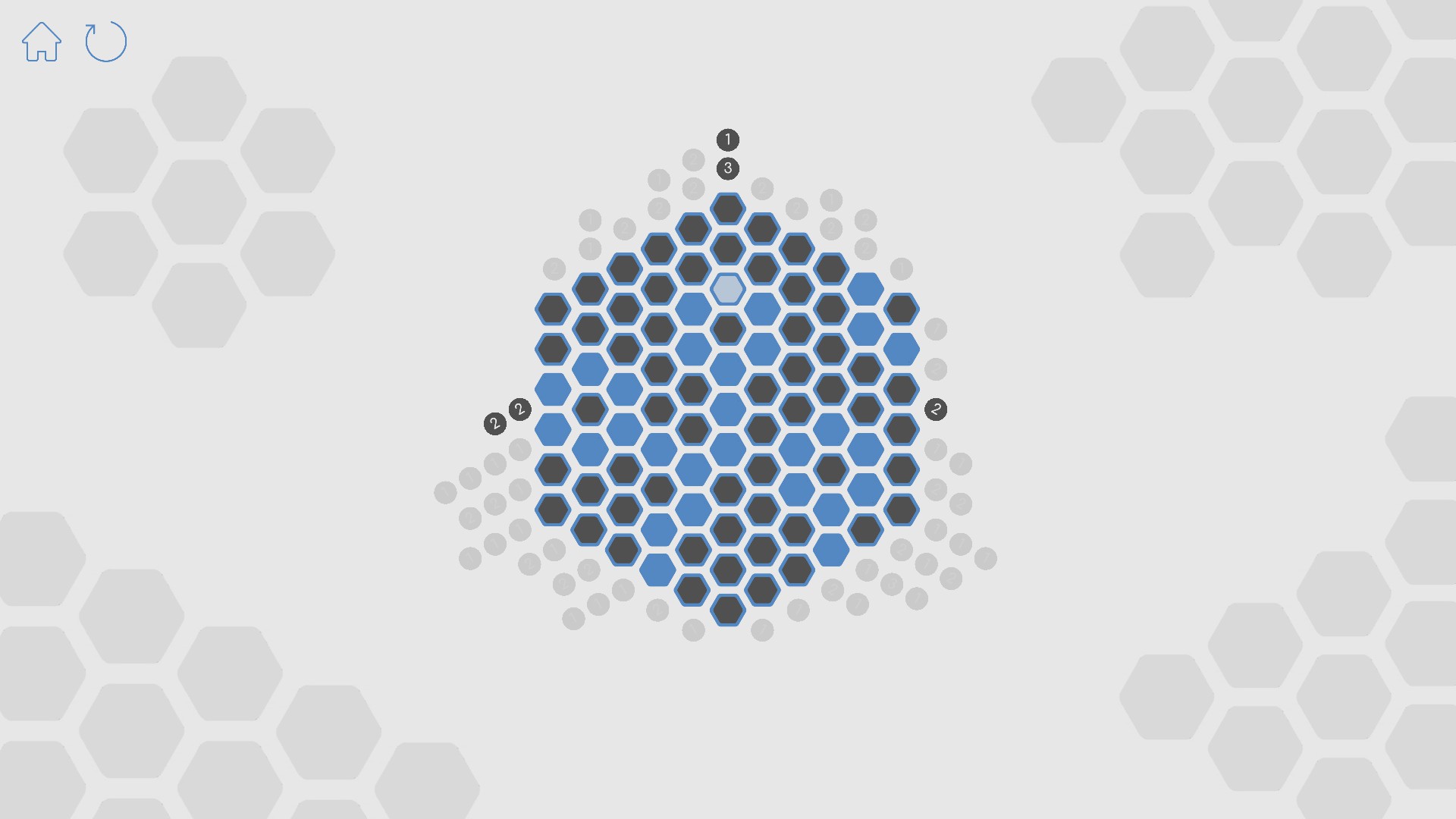Hex PiCross is a picross game built on a hexagonal grid with a beautiful minimalist design and a uniquely prepared soundscape. Click to color the hexagonal cells so that all columns and diagonals are zero.