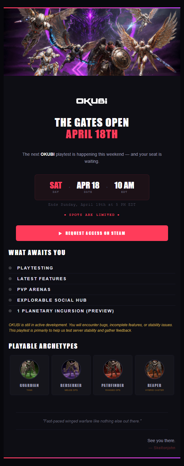 OKUBI is a fast-paced PvP combat game where brutal melee combos collides with adrenaline-fueled aerial battles. Deploy your wings and experience razor-sharp control and unmatched freedom of movements in various battlegrounds and arenas.