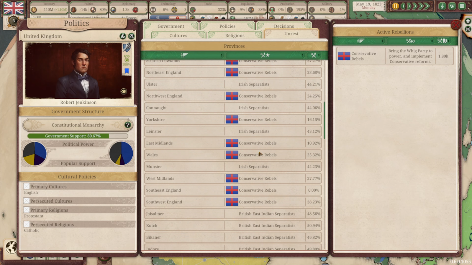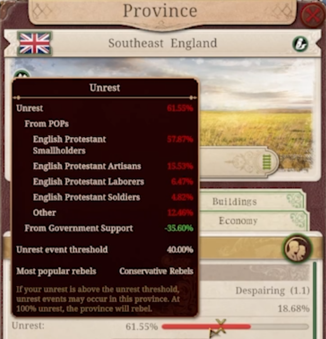 The main causes of Unrest are low Government Support andhttps://www.youtube.com/watch?v=yuMmyNwlMlQPOPs with low Happiness (although other factors can also contribute to it).
