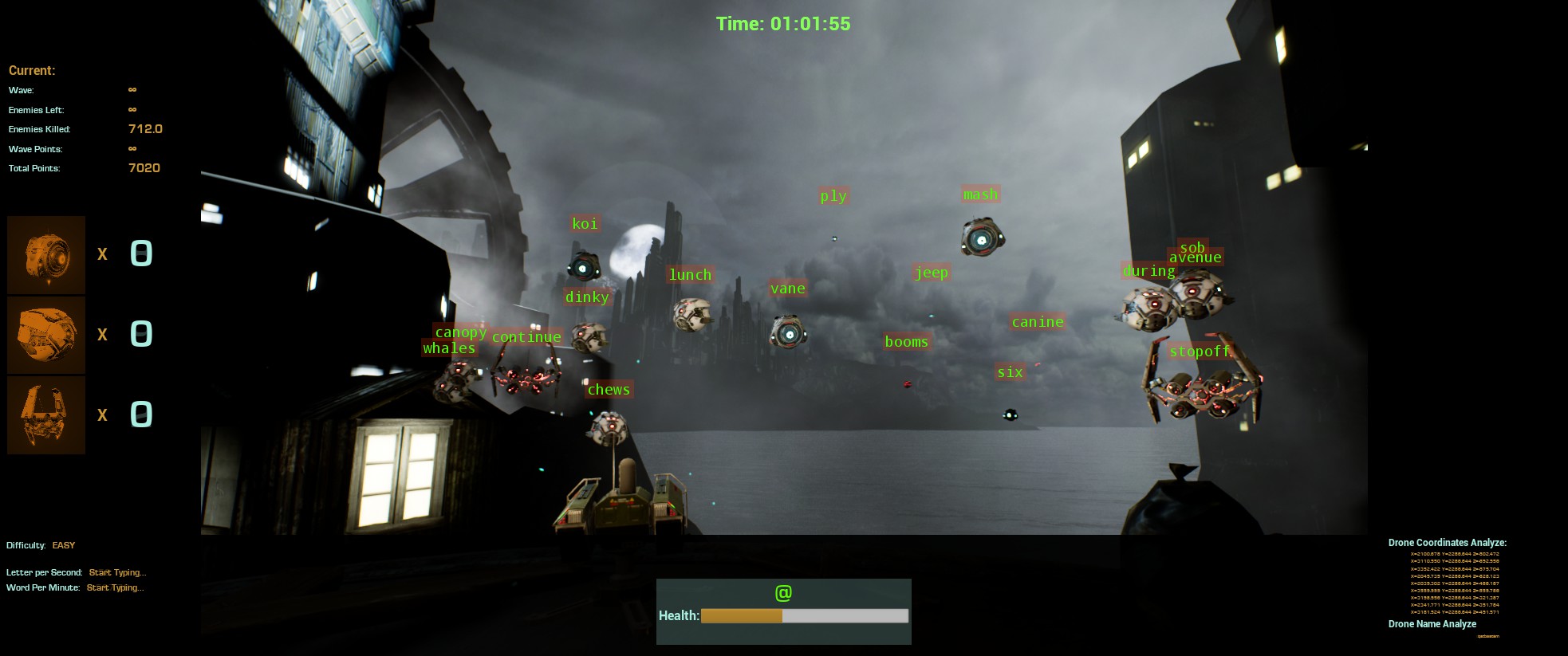 "Improve your typing skills" To shoot your enemies, you have to type the ID of the drone correctly. And you should type fast to gain more points, and achieve upper levels.
