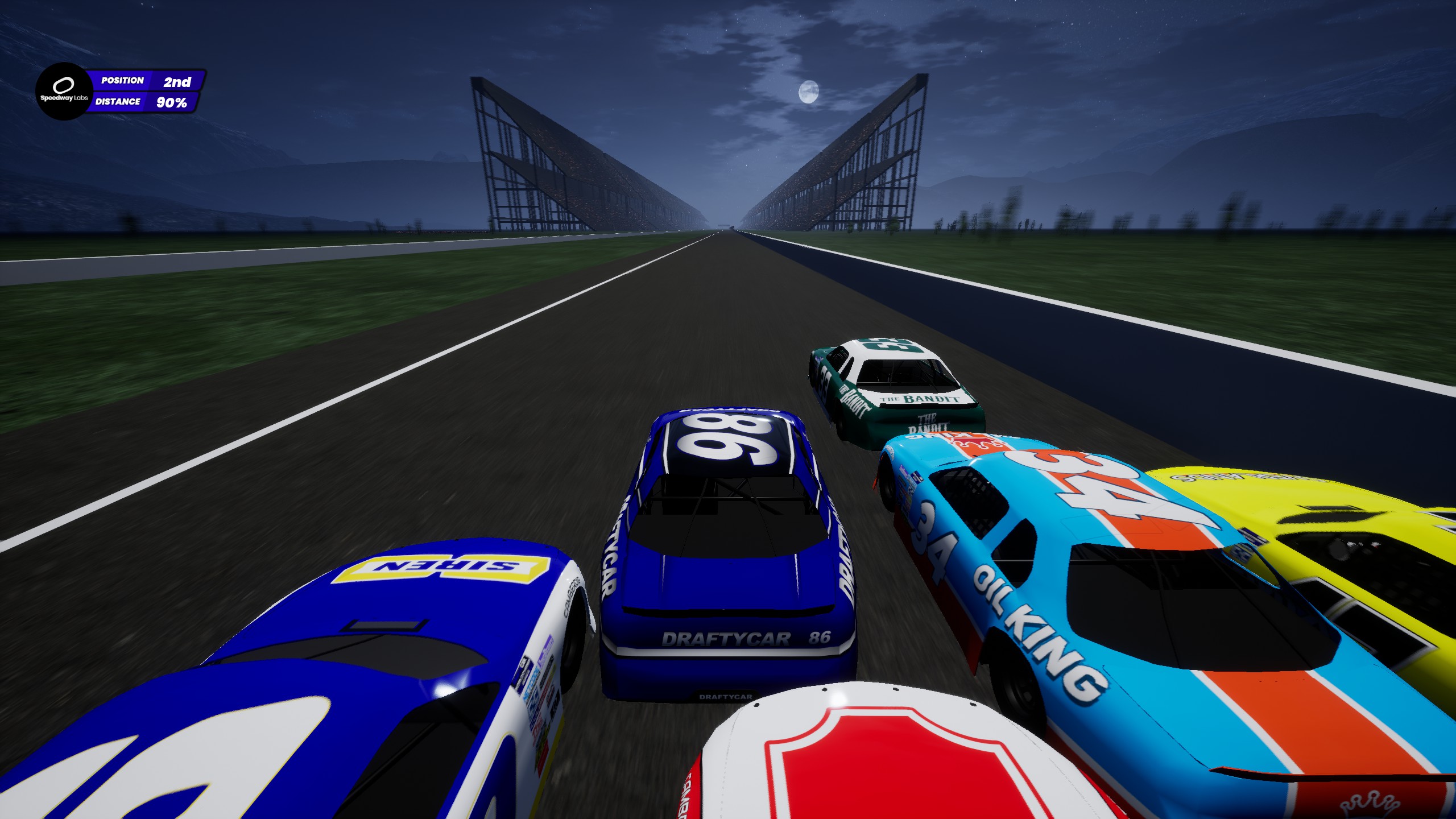 DRAFTYCAR is a fast-paced racing game simulating the art of professional stockcar drafting. Tweak the physics to your liking and immerse yourself in pursuit of victory. Strategically place your car to gain speed, disrupt your competition and navigate a high-speed drag race to the finish.