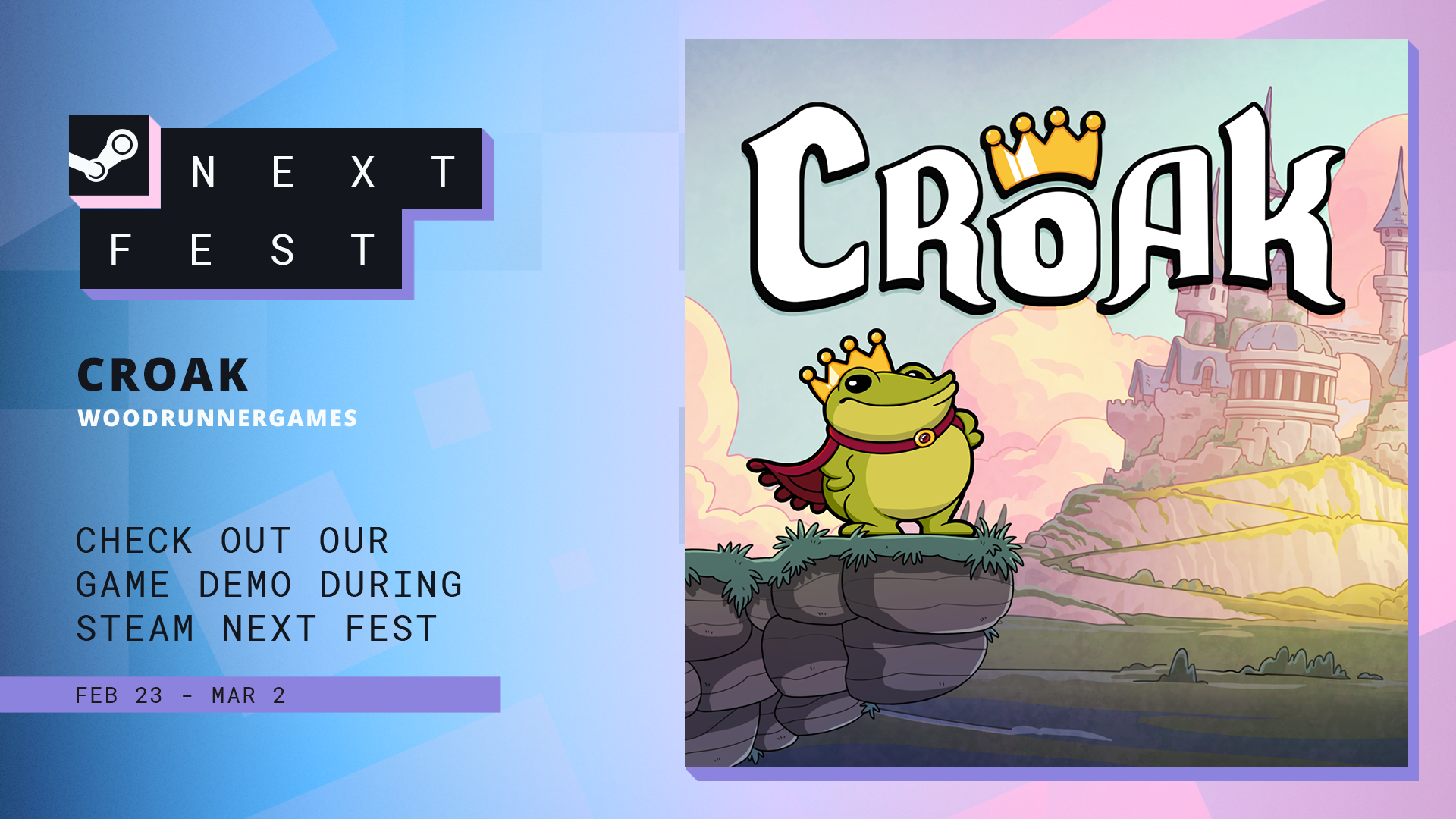 CROAK is a fast-paced platformer where your tongue grapple is your ultimate tool. Pinball your frog through constantly shifting environments. Jump into chaotic battles against goofy, over-the-top bosses. Be ready: it’s about to get bouncy.