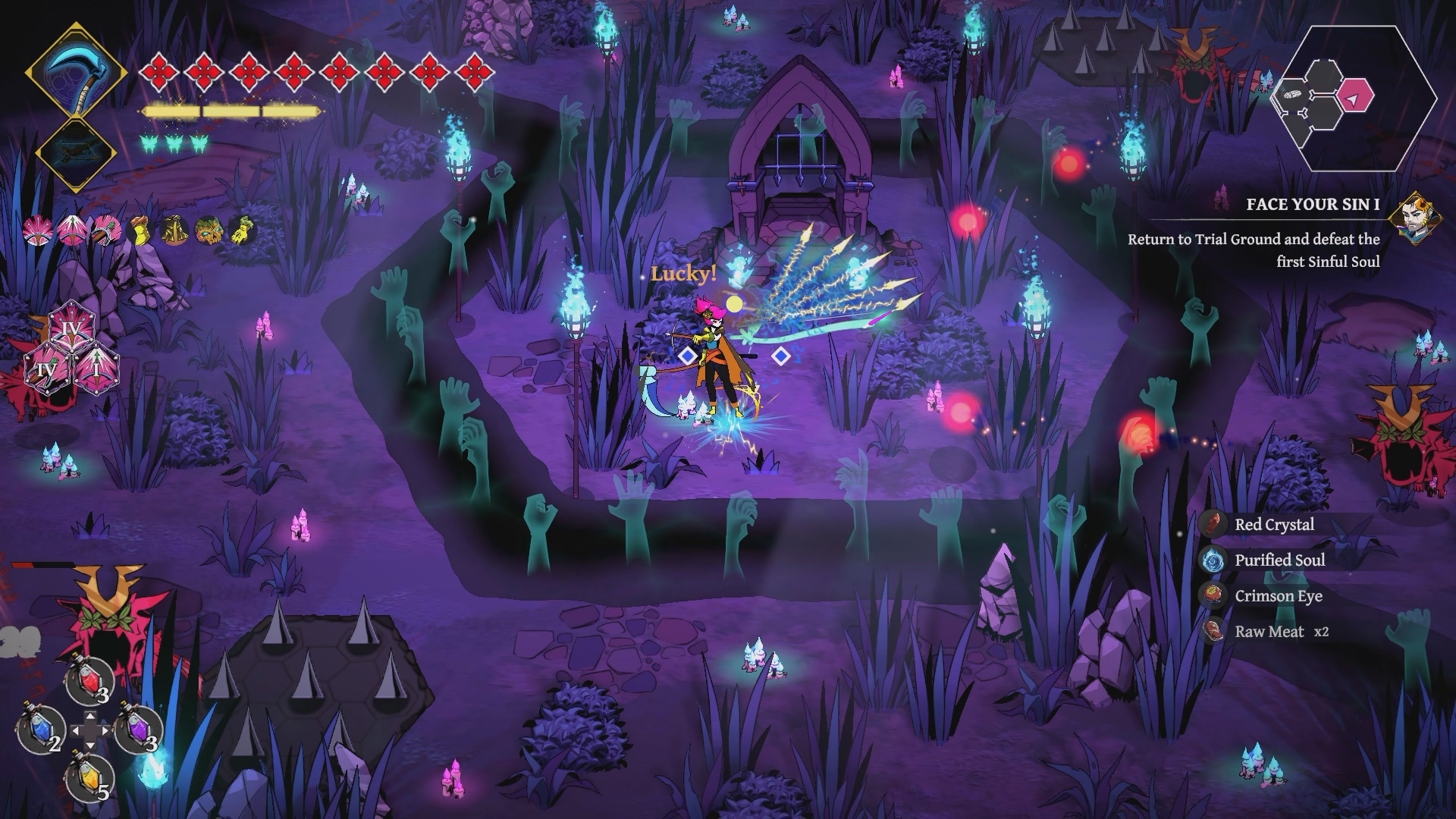 Our team also has their own preferences when it comes to the weapons. Someone from our team loves using the hammer because of its high burst damage and its ability to allow Avelin to reposition before she lands an attack. They also paired this with a loadout that allows players to pull enemies into one area before finishing them off to vacuum enemies into hammer time! Another dev created a DPS crossbow build, which ended up outperforming their melee weapons! We even have someone who likes to stay true to the Grim Reaper style by sticking with the scythe for fast-paced combat.