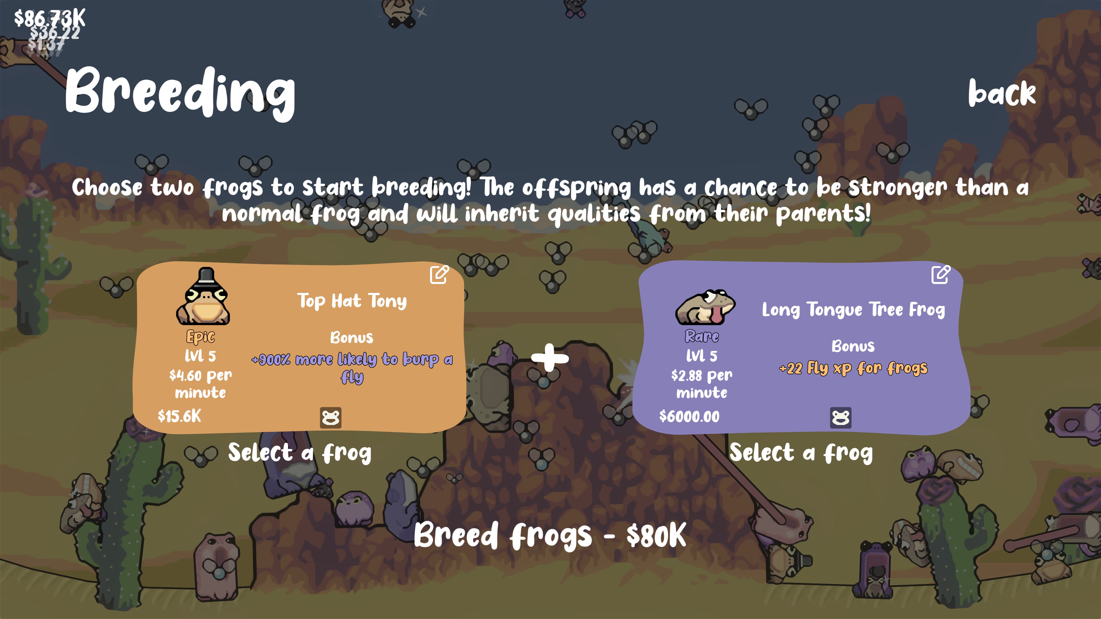 Croakoloco is a relaxing frog collecting idle game. Watch them jump, croak, and eat delicious flies. Grow frogs, feed frogs, or take control of one in “Froggy Mode” for a more active play style!