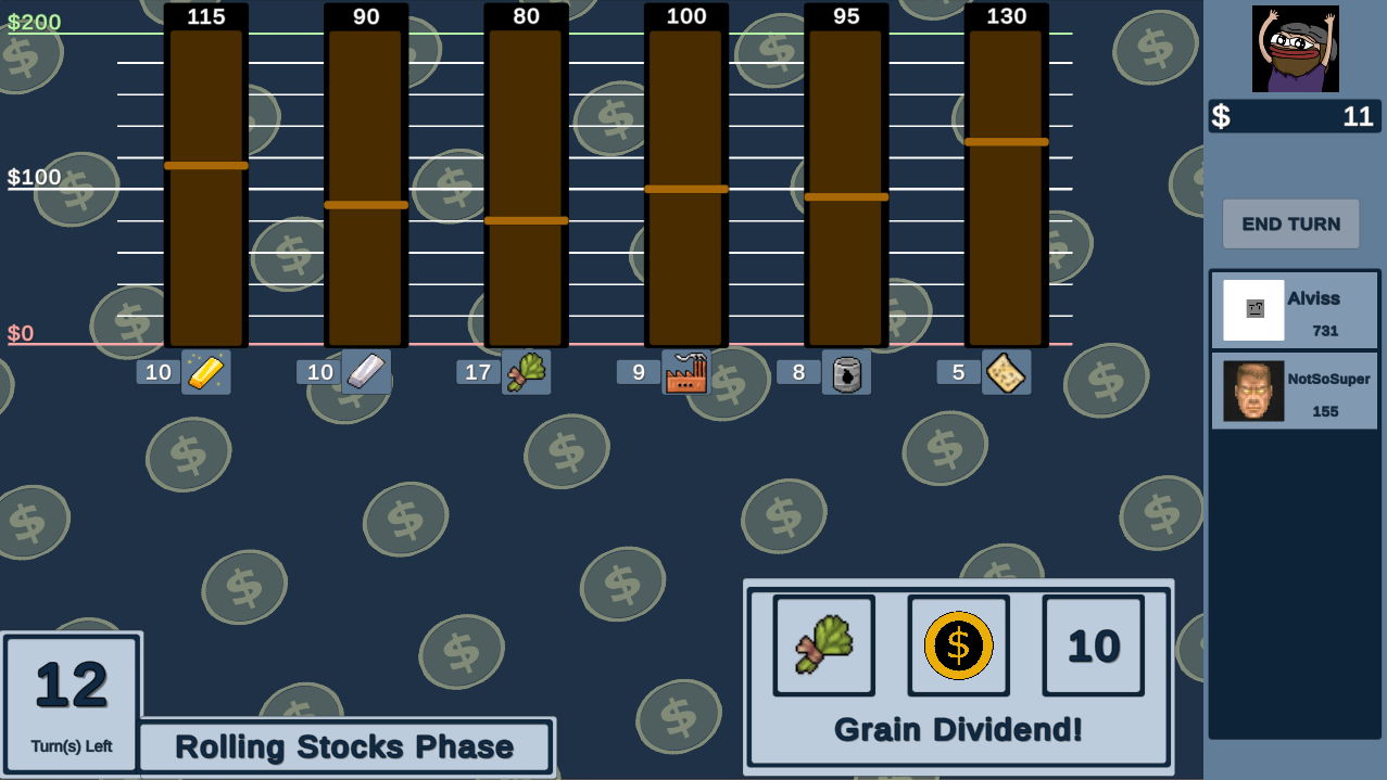 Buy and sell commodities with friends to see who will be the fattest Wall Street Cat! Speculate low value stocks will rise to be re-sold for a profit! Cry as the stocks you paid too much for plummet for the second time in one turn!