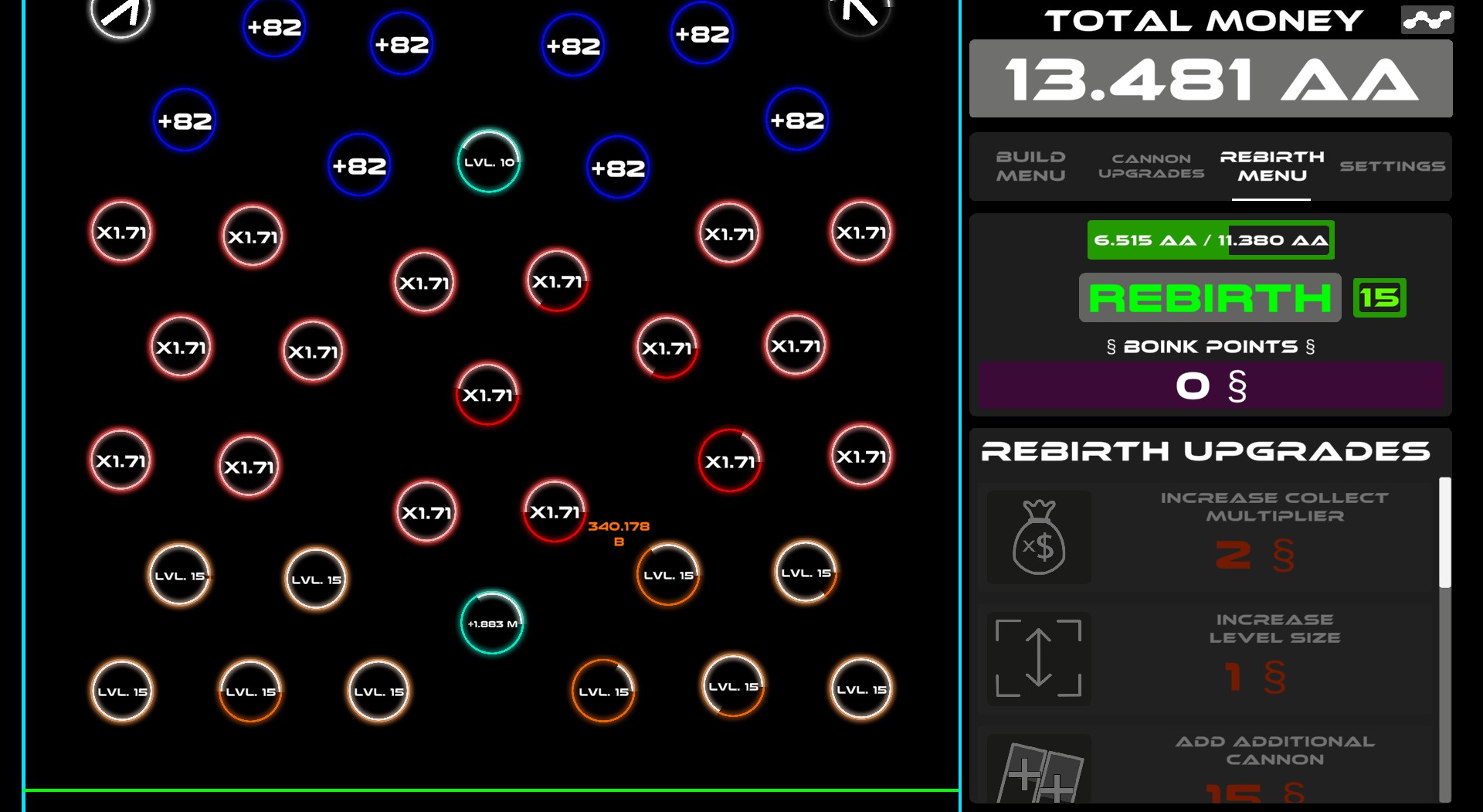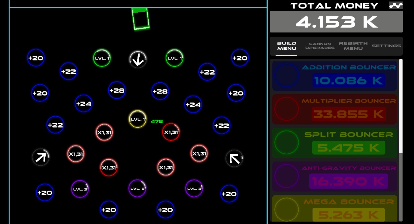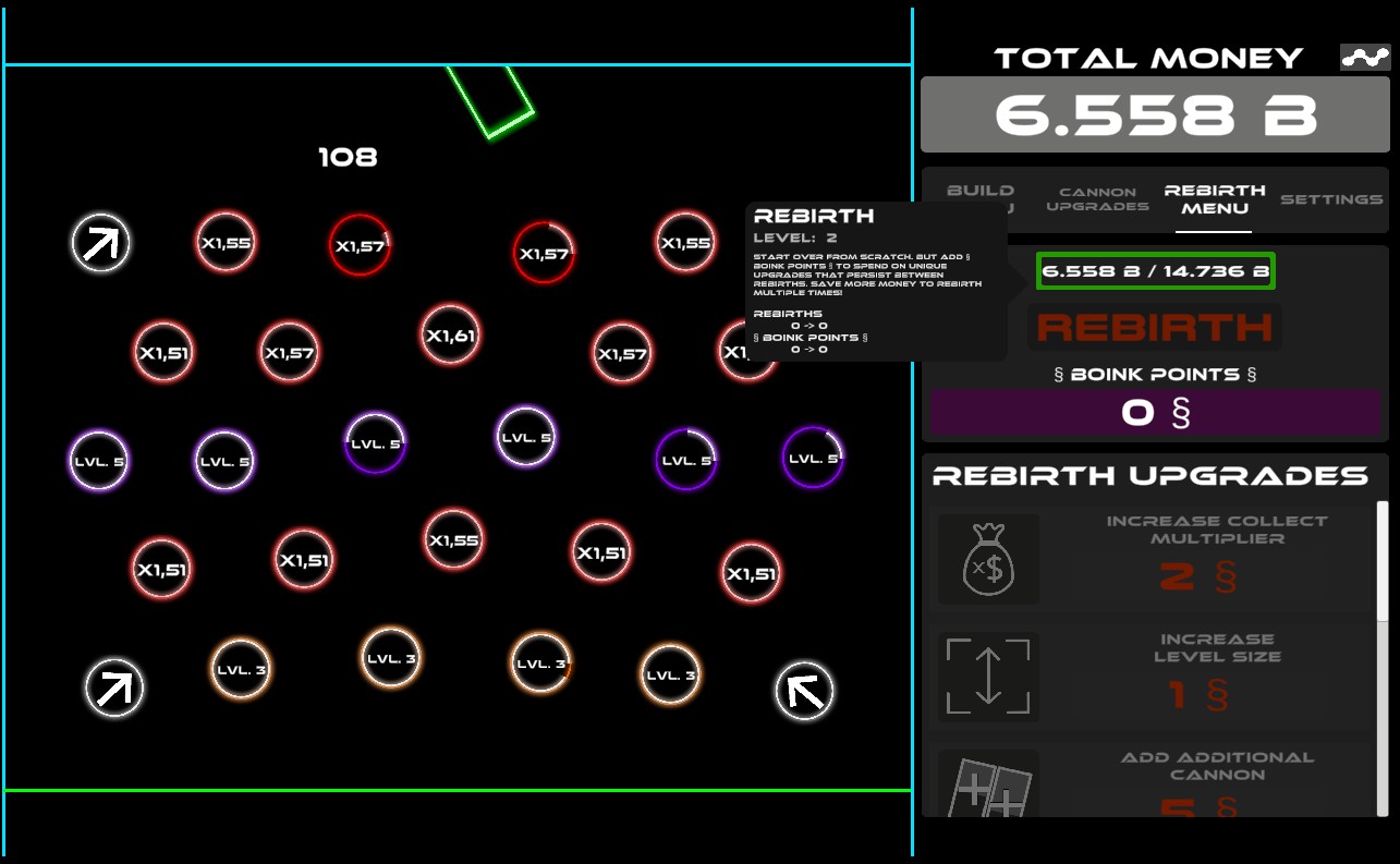 Boink! A game about falling money and building bouncers to increase the money. Purchase bouncers and place them on the map. Upgrade bouncers and the cannon to boost value. Rebirth to gain unique upgrades. Watch your money grow!