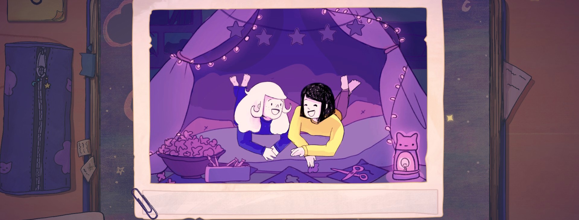 Pieced Together is a cozy scrapbooking game that takes you on a heartfelt journey about friendship and getting older. Sort items, solve gentle puzzles, and decorate the scrapbook as you uncover the story piece by piece.