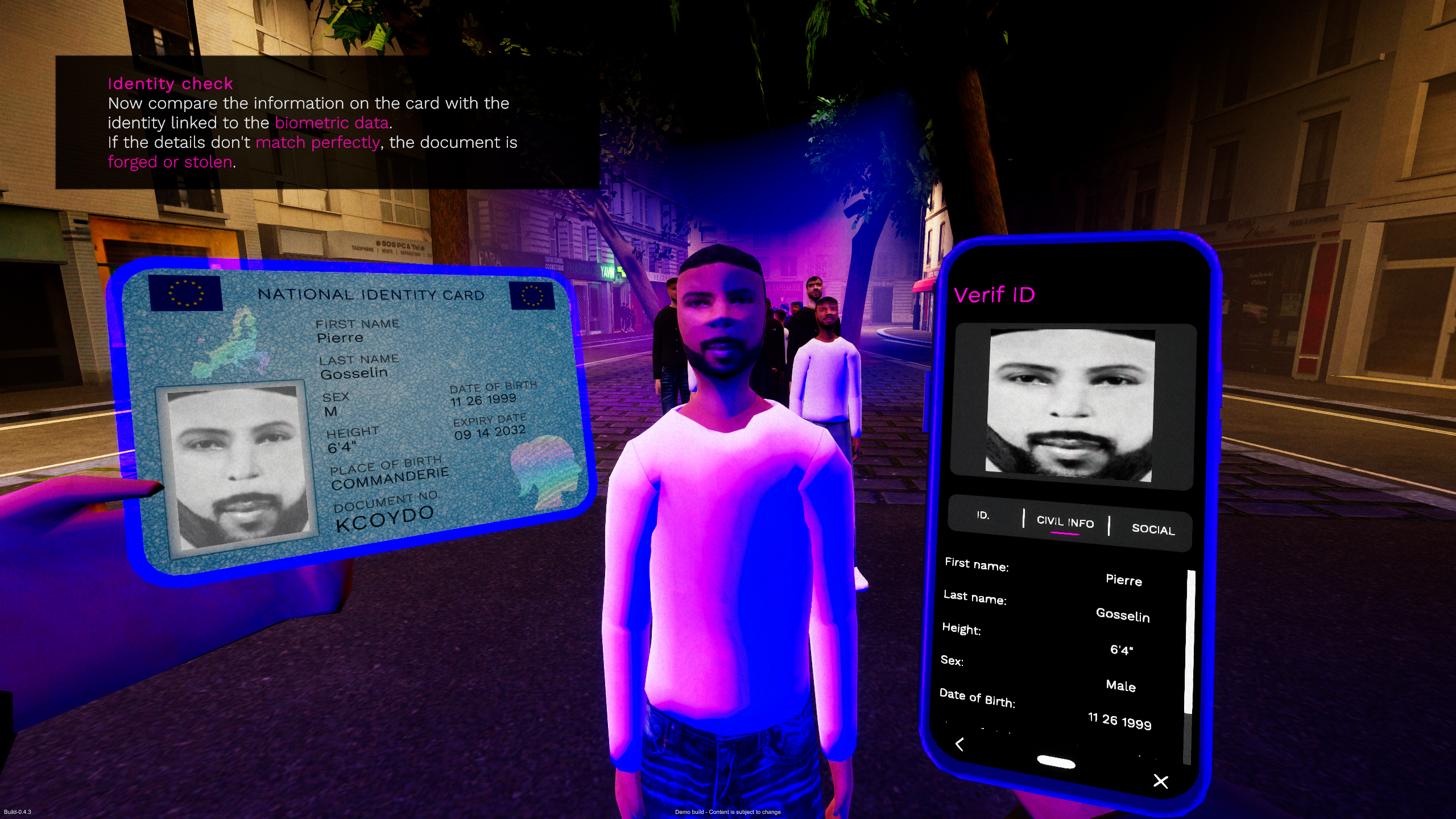 The UX of controlling ped's identity has been reworked. I've decided to integrate ID Cards as an interactive 3D object. You'll be able to hover fields on the card such as the first name, last name, birthday, ethnicity, ... Clicking on them will ask directly a question to the ped controlled to verify the information and ensure it's not fake.
