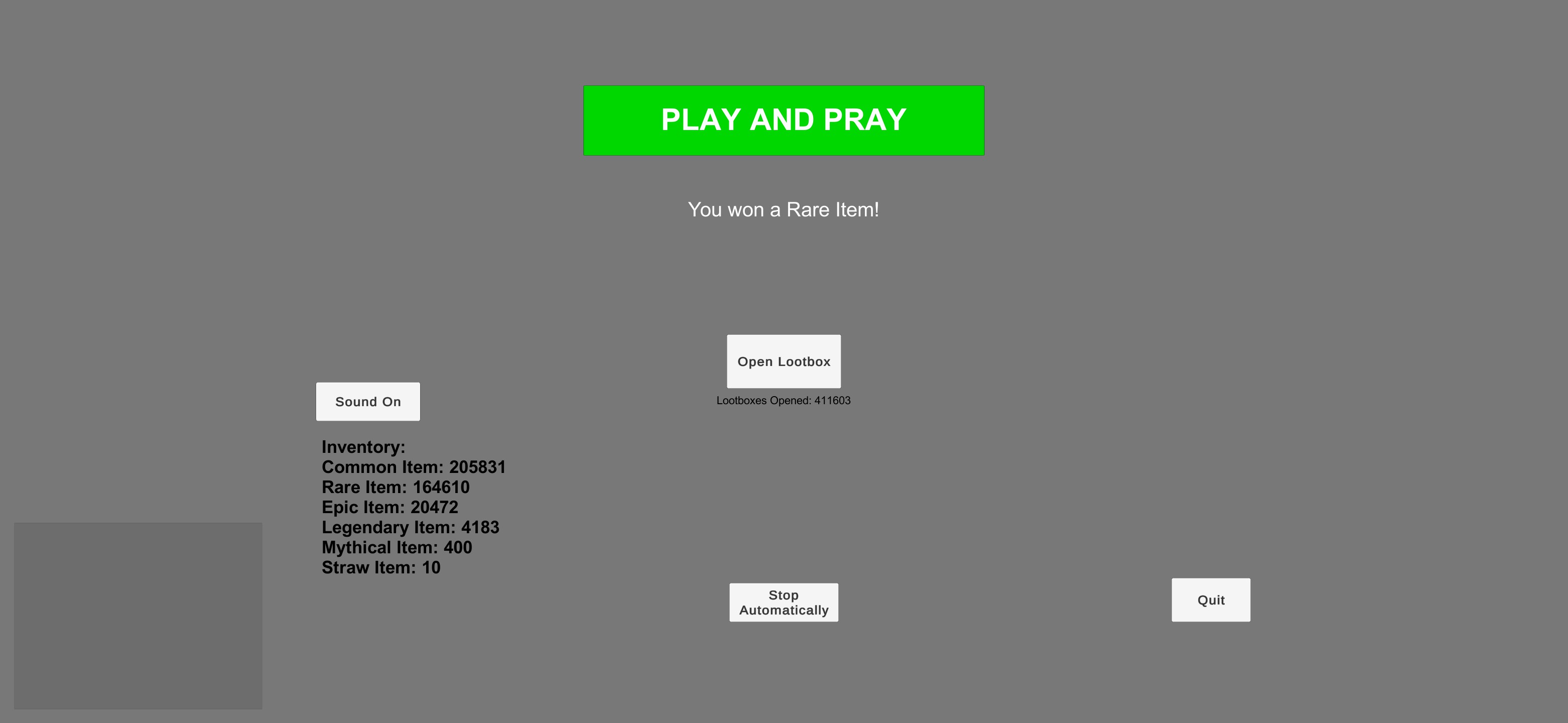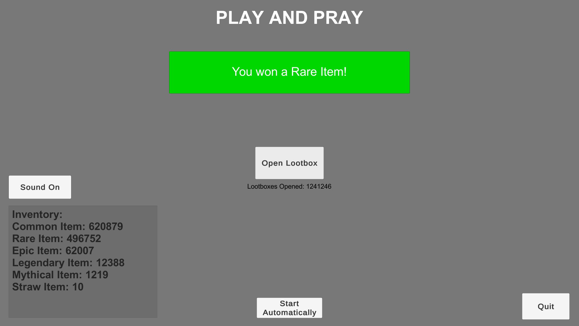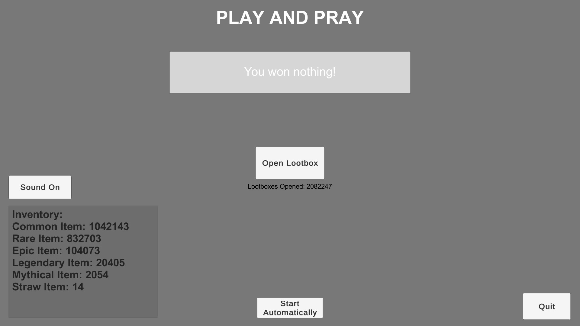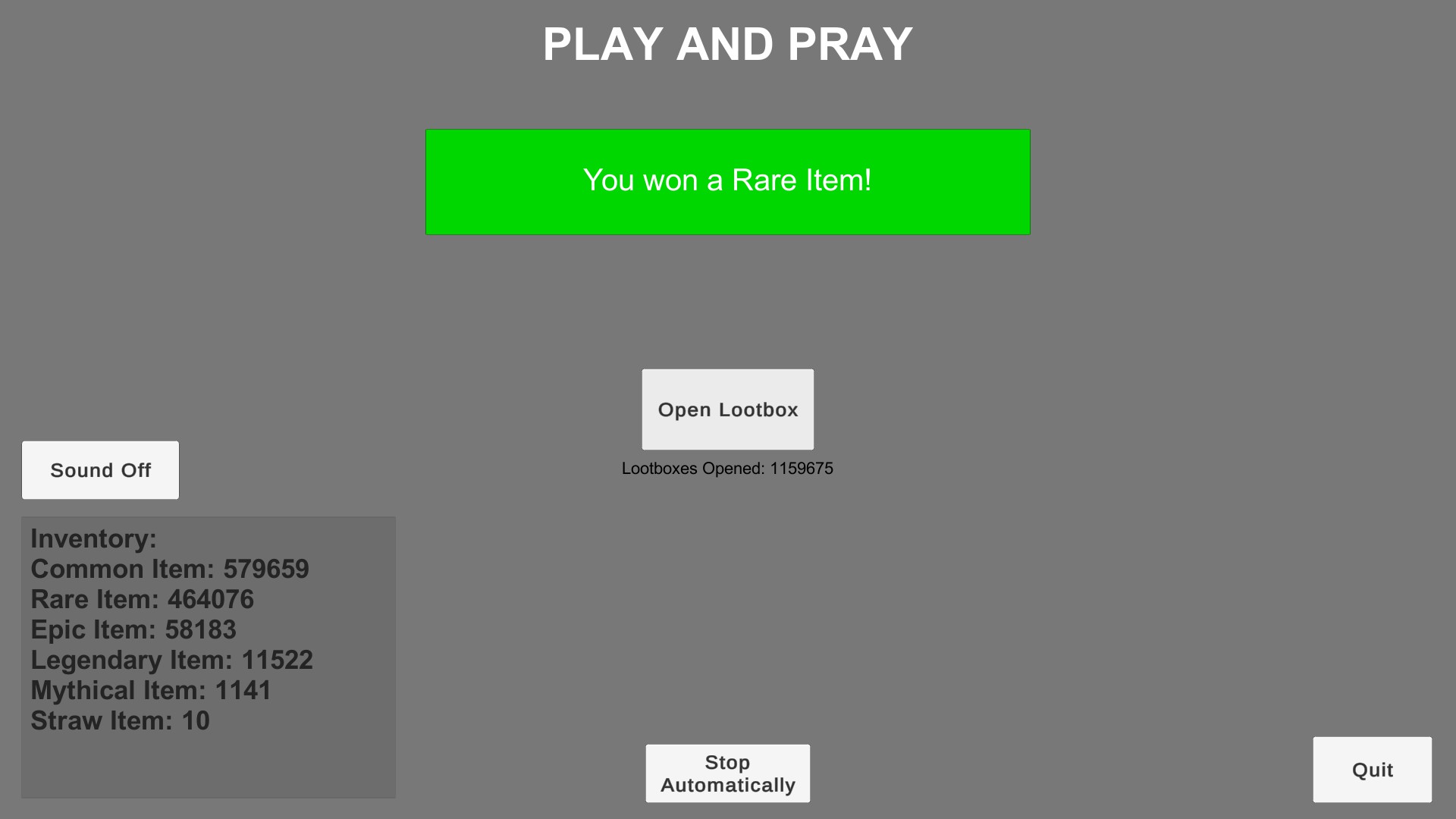 Play And Pray is a clicker game where you can open as many loot boxes as you want. As you collect more items in your inventory, you'll unlock various achievements.