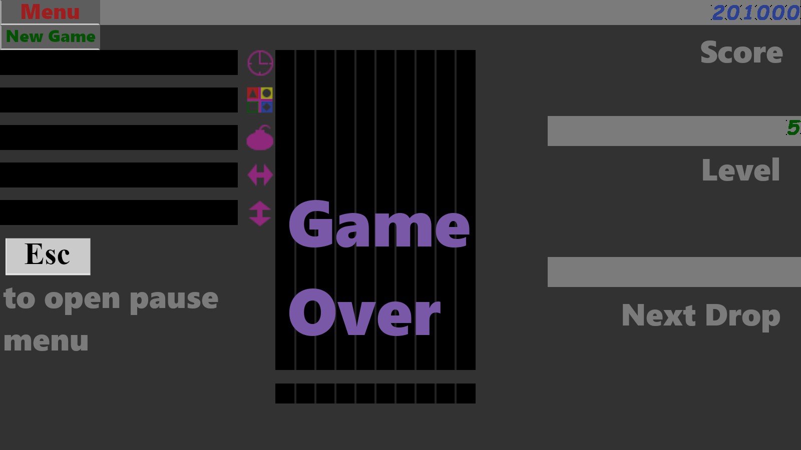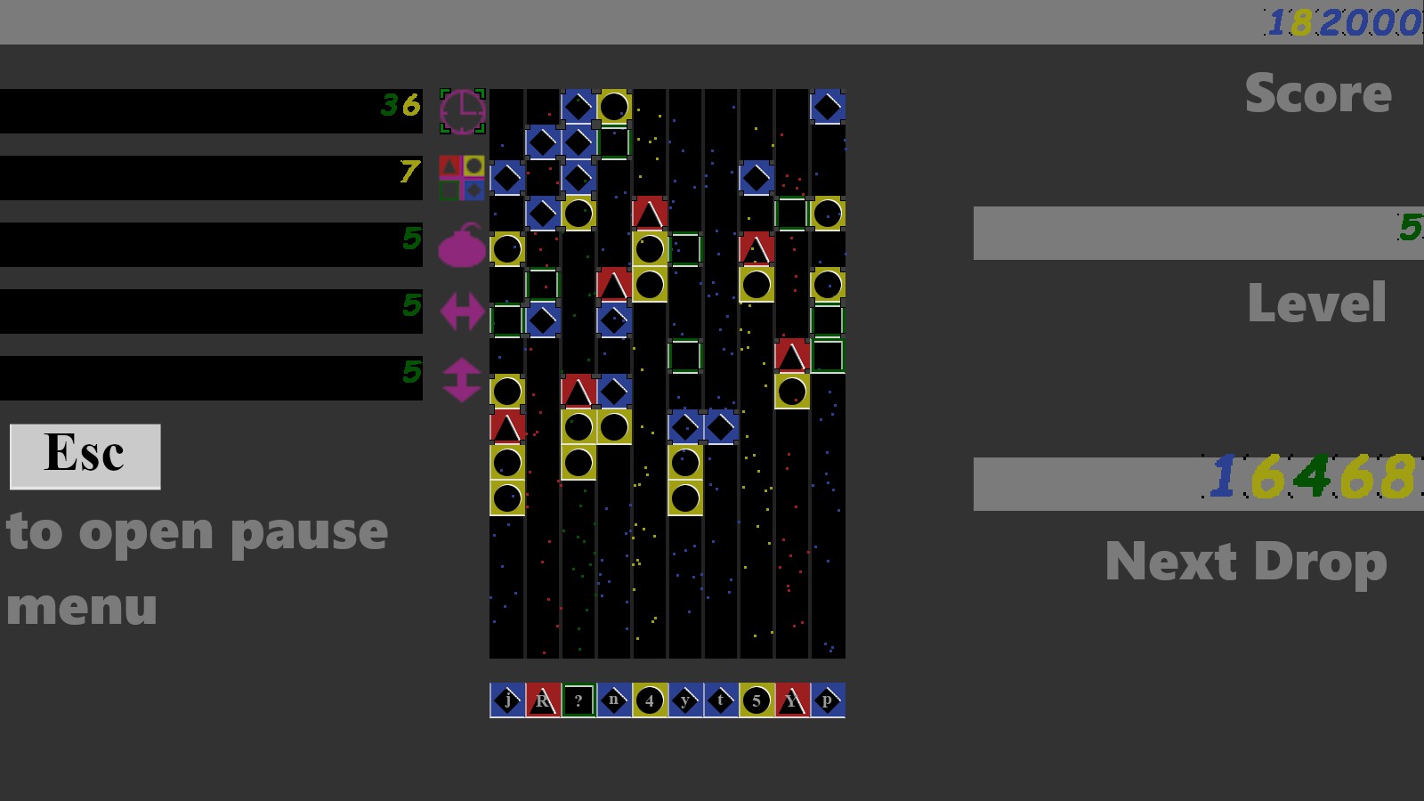 a block matching game. blocks are selected by typing the matching keyboard character. over time new rows are added to the board and the blocks on the board drop further. clear the blocks on the board before they reach the bottom.