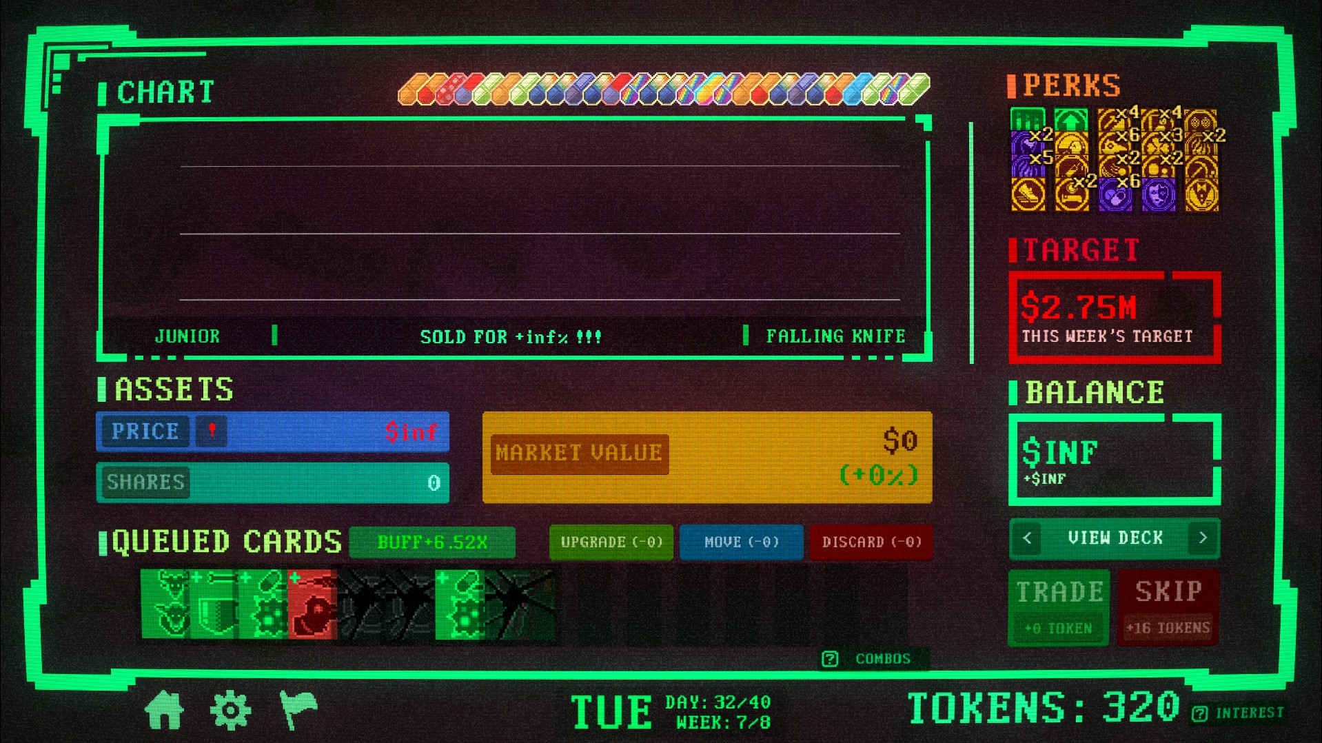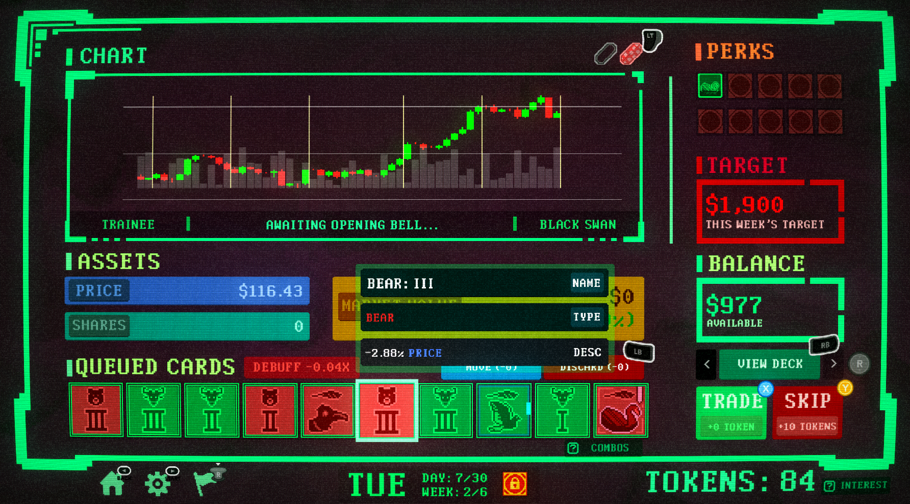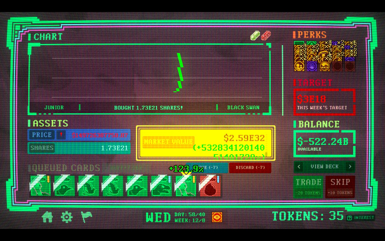 Insider Trading is a roguelike deckbuilder where you bend the market to your will. Synergize perks, manipulate stock prices, and trade wisely or risk pricing yourself out.