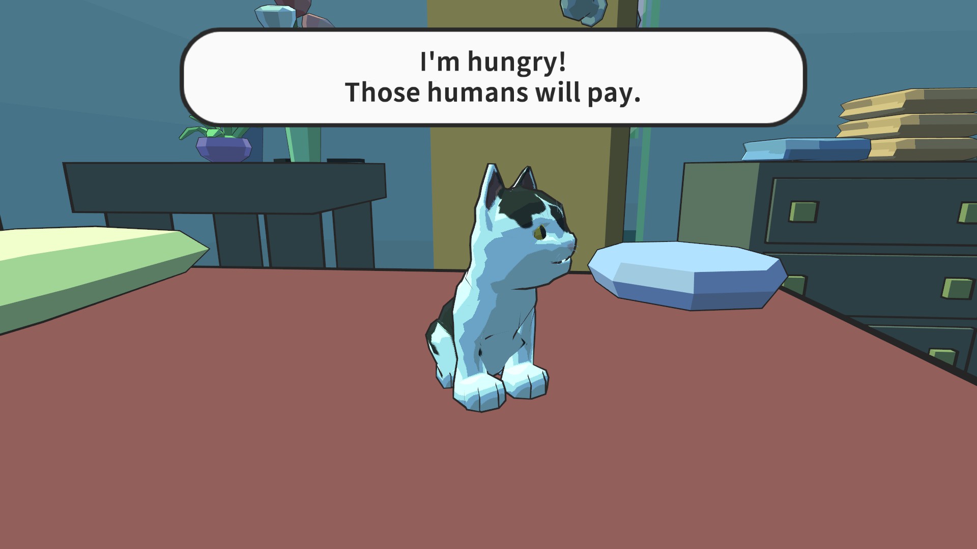 Catlateral Damage is a first-person destructive cat simulator where you play as a cat on a rampage, knocking as much stuff onto the ground as possible.