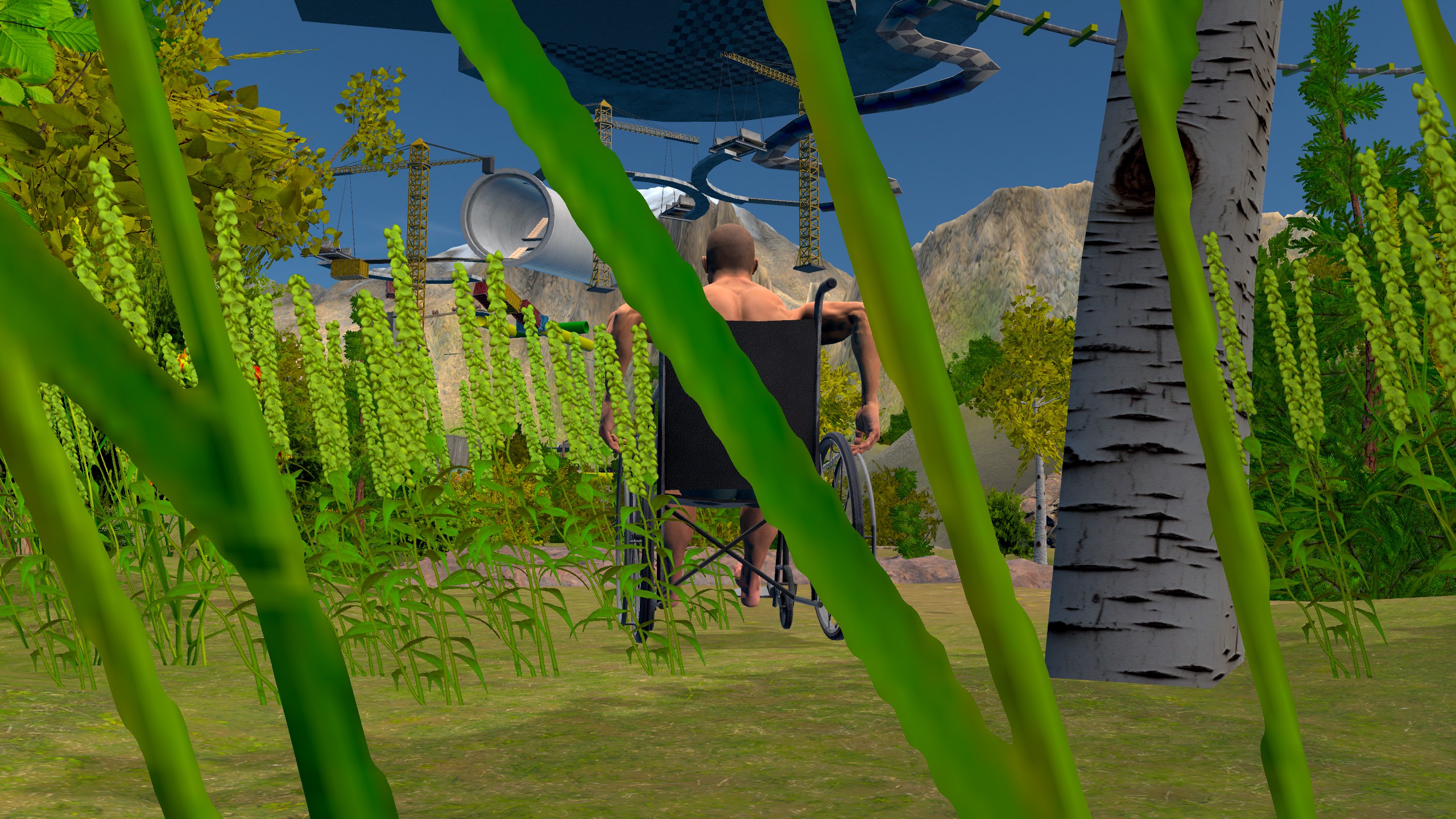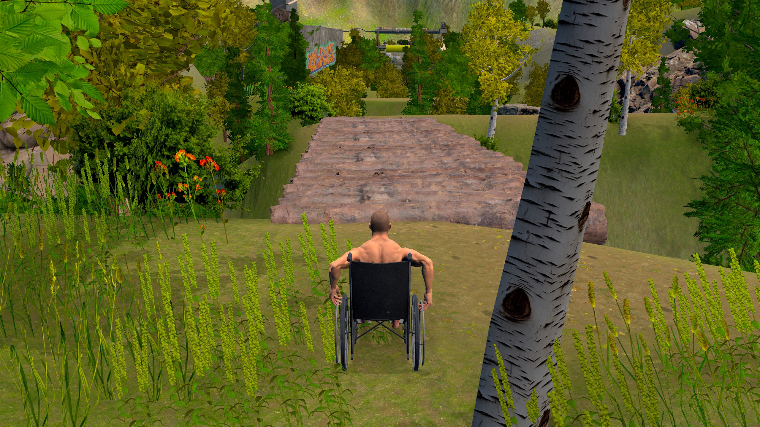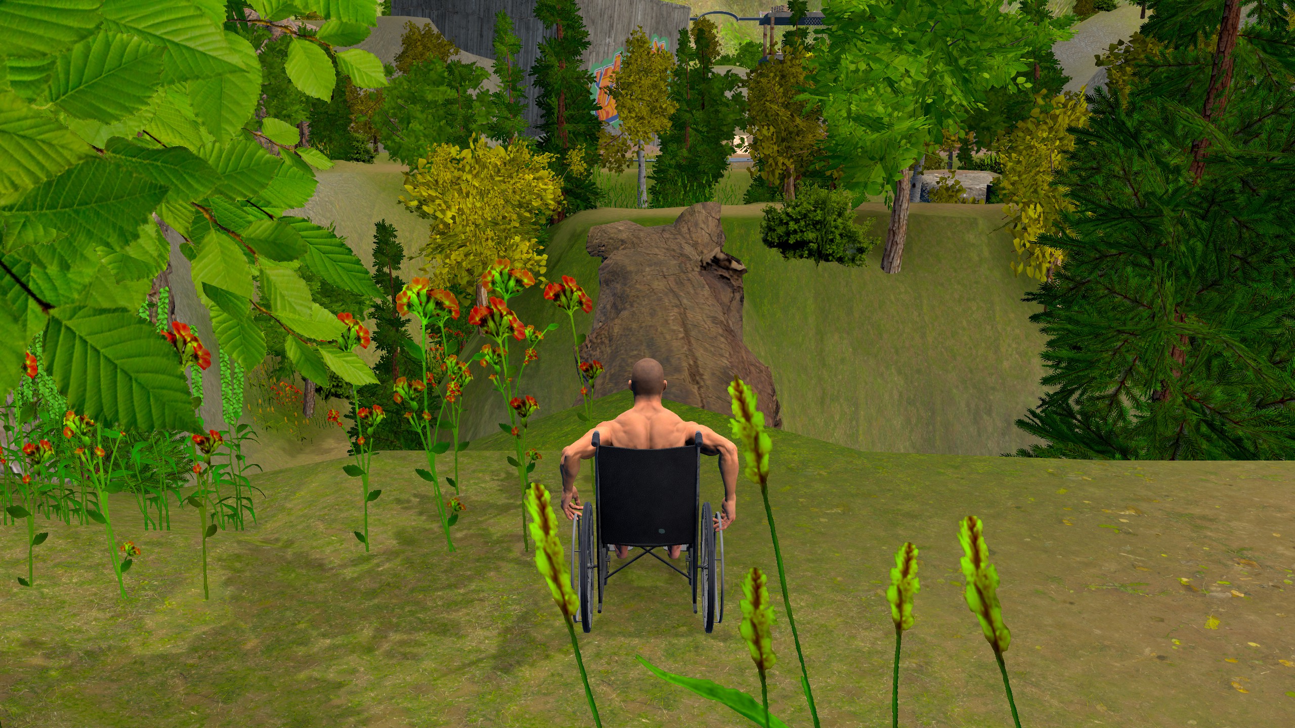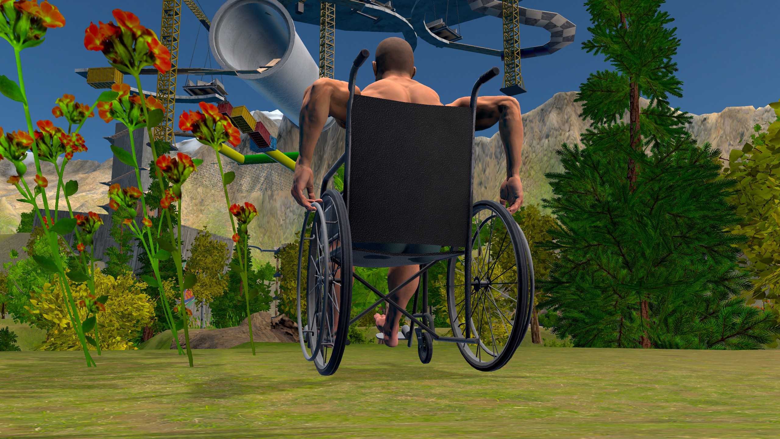Overcome the obstacle course while sitting in a wheelchair, using unique controls.