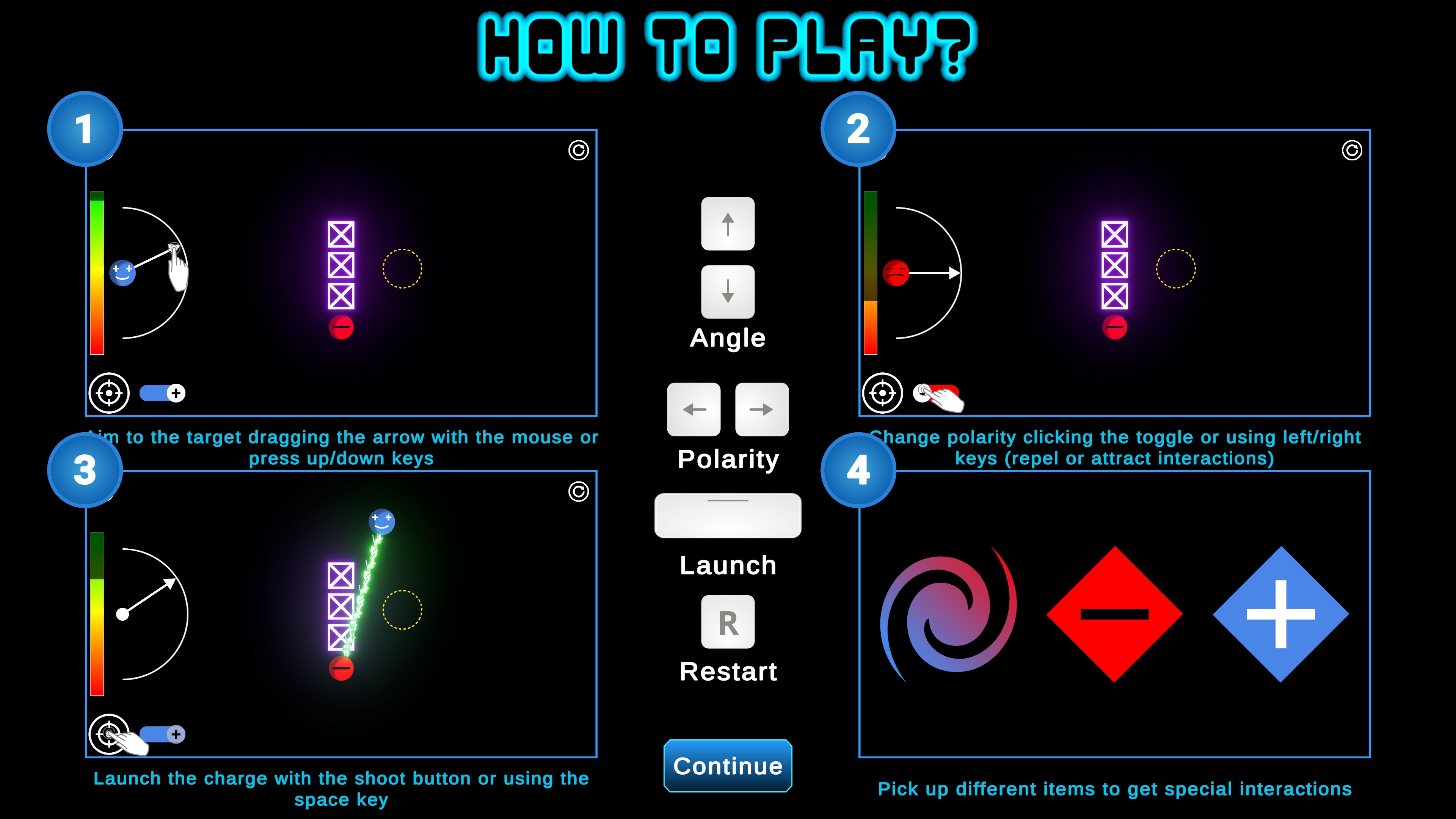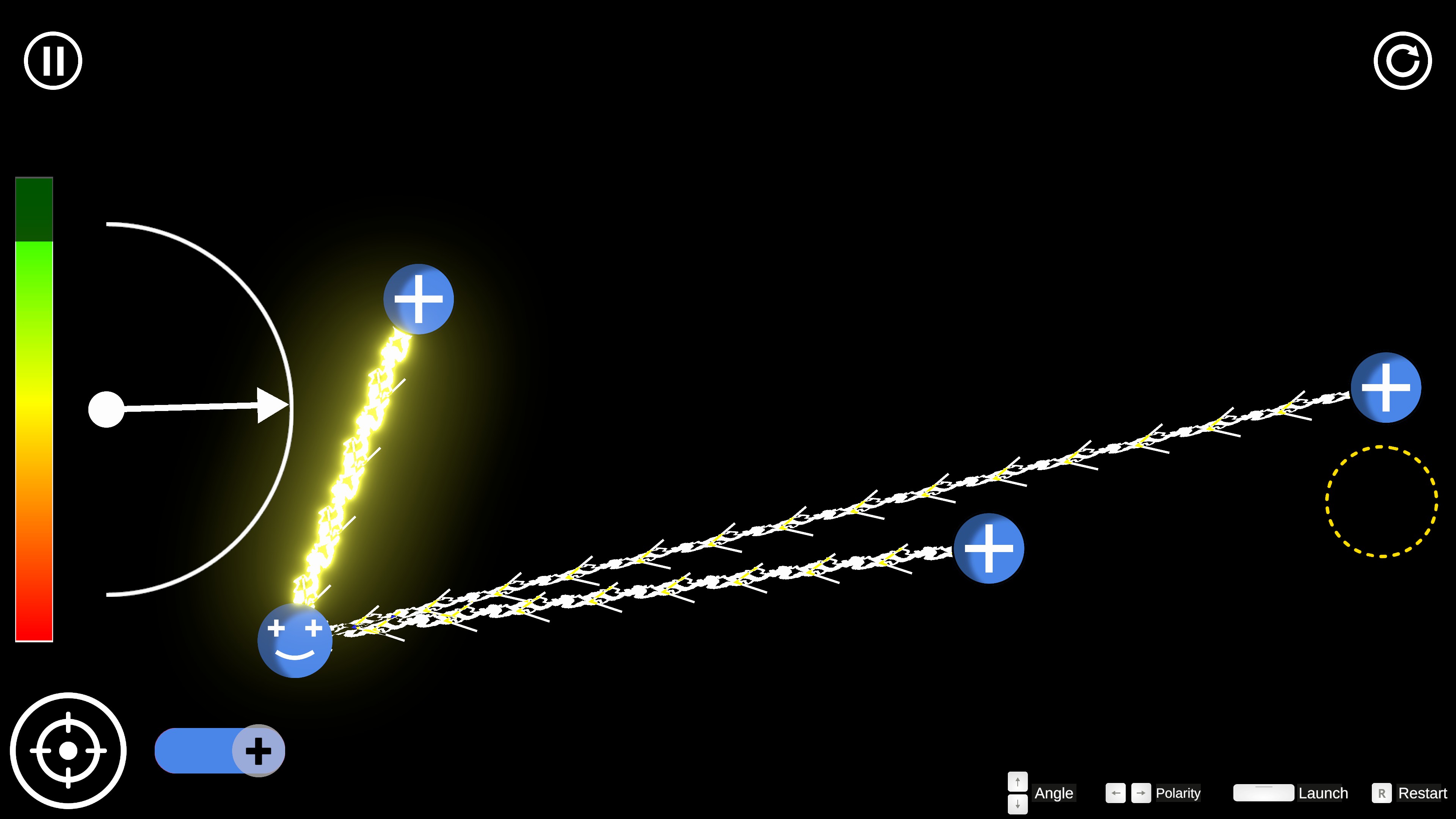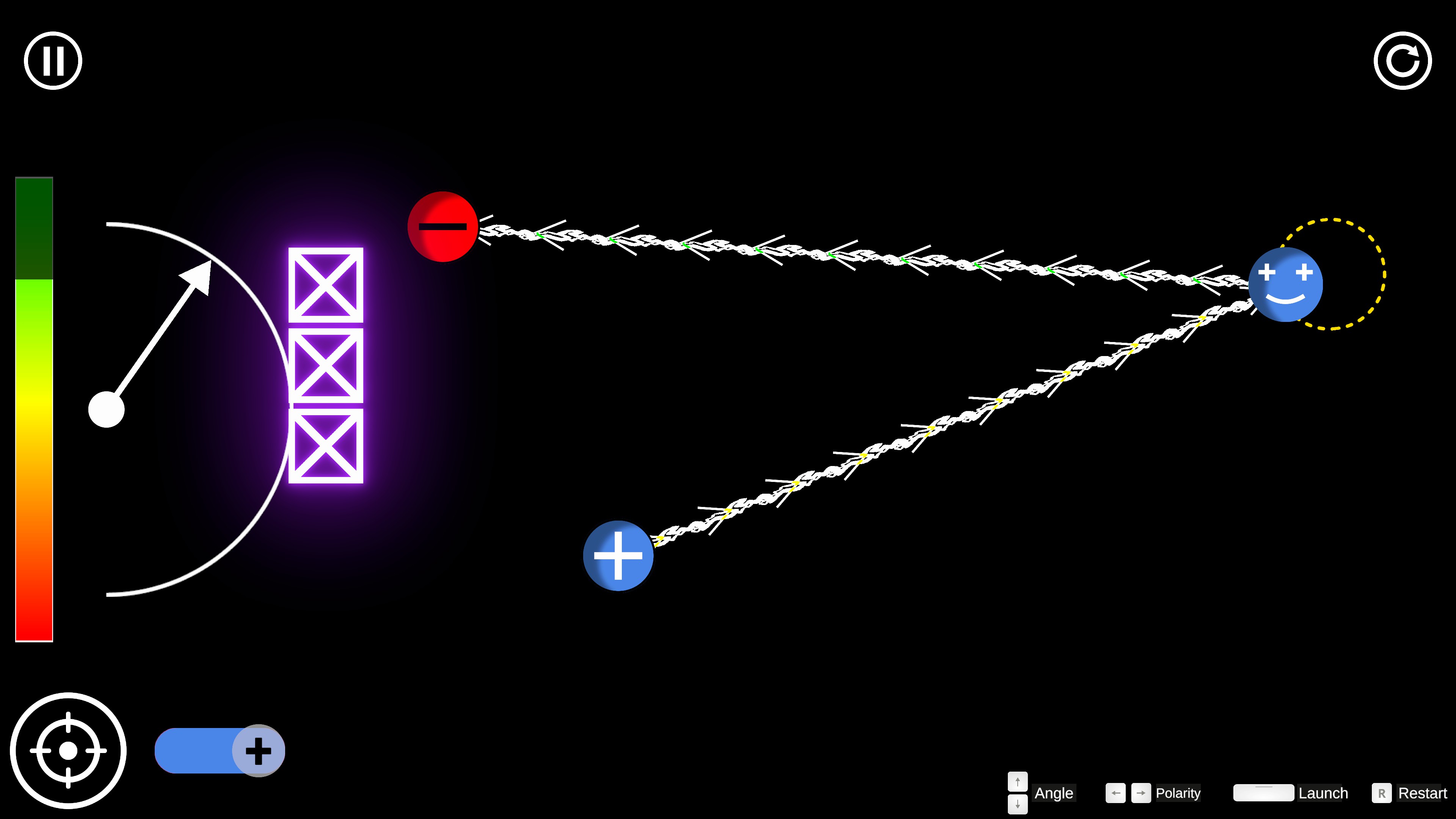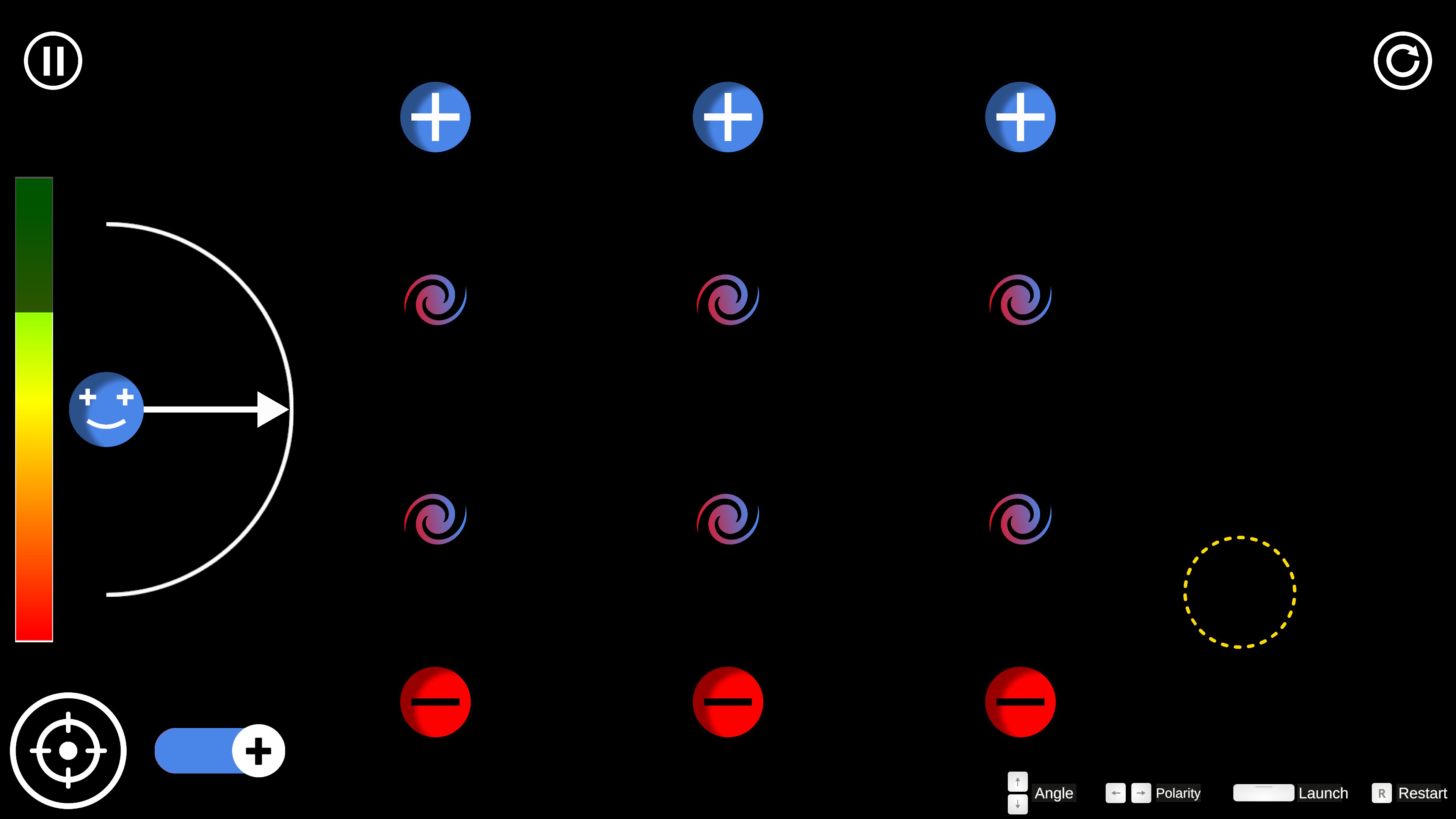 Welcome to Electrial!, an innovative puzzle game based in electrical physics. You will clear levels by interacting with charged elements. Choose between a positive or negative charge, then launch it at an appropriate speed and angle to reach the target!