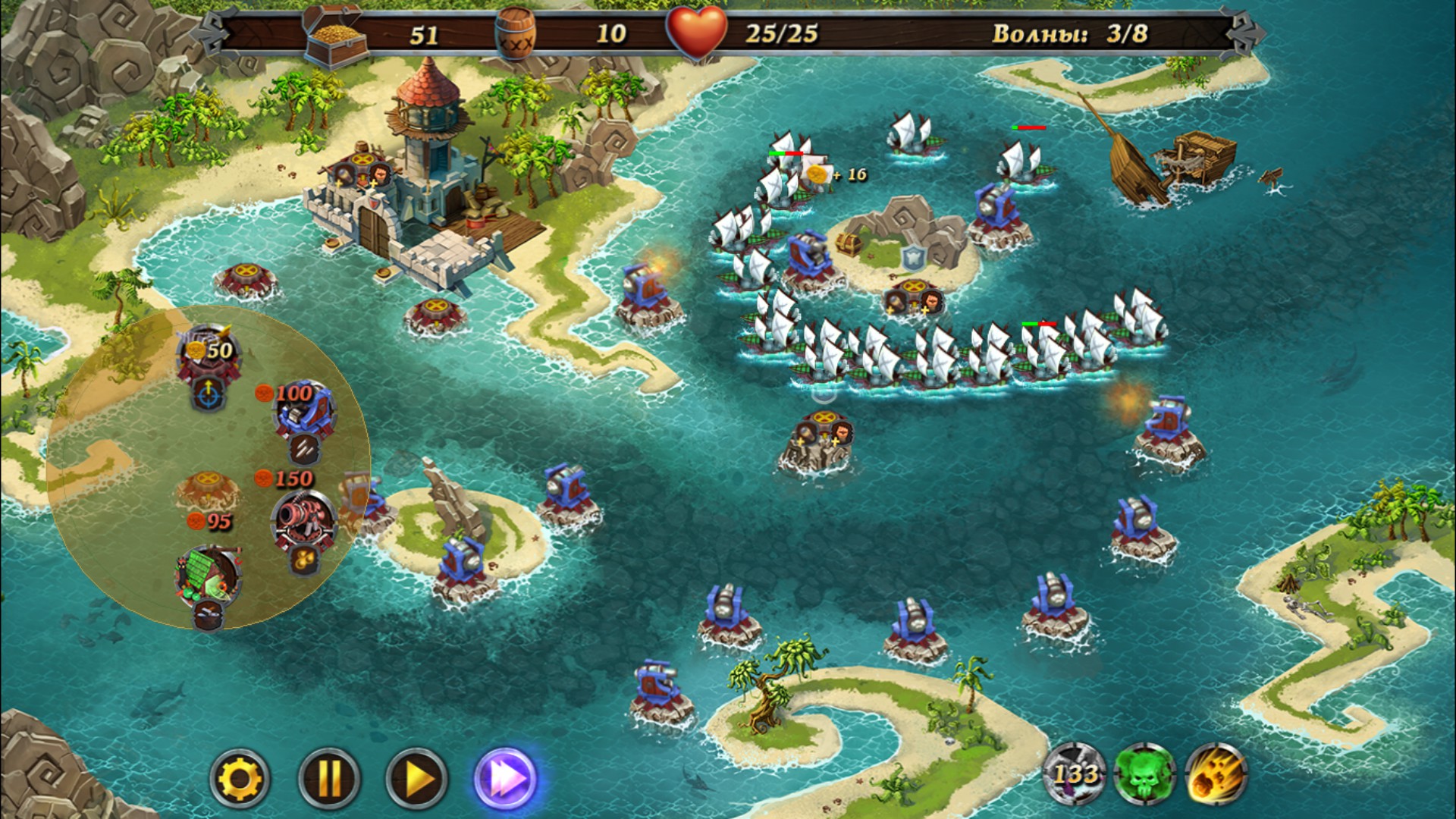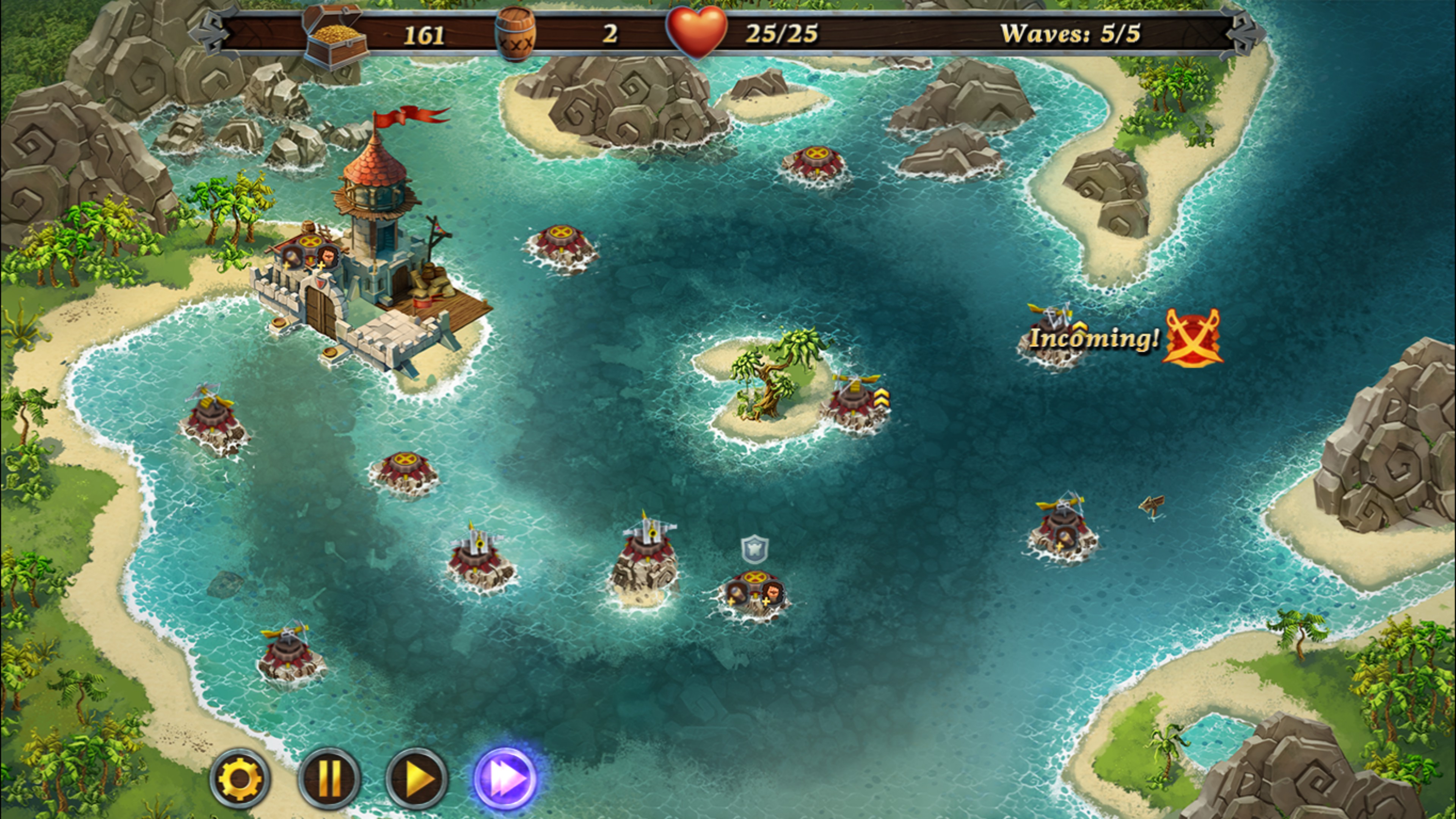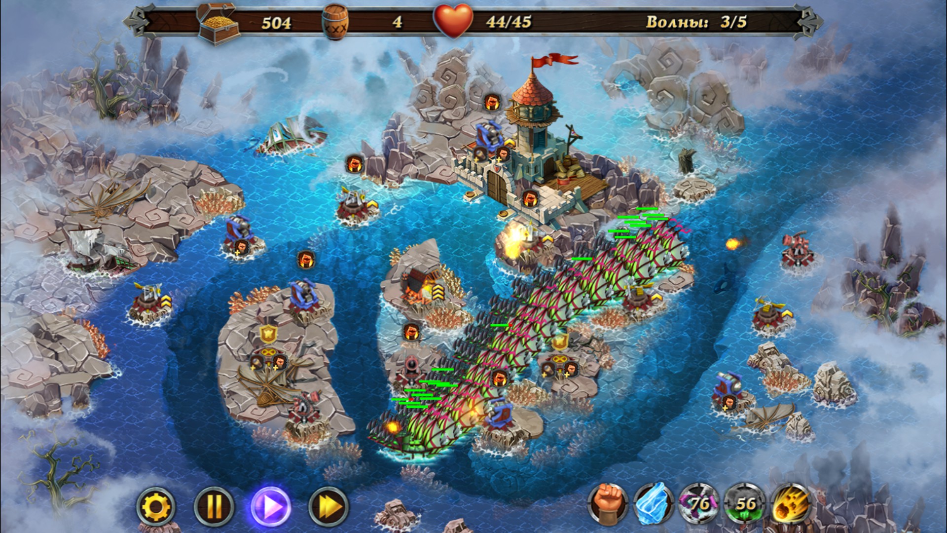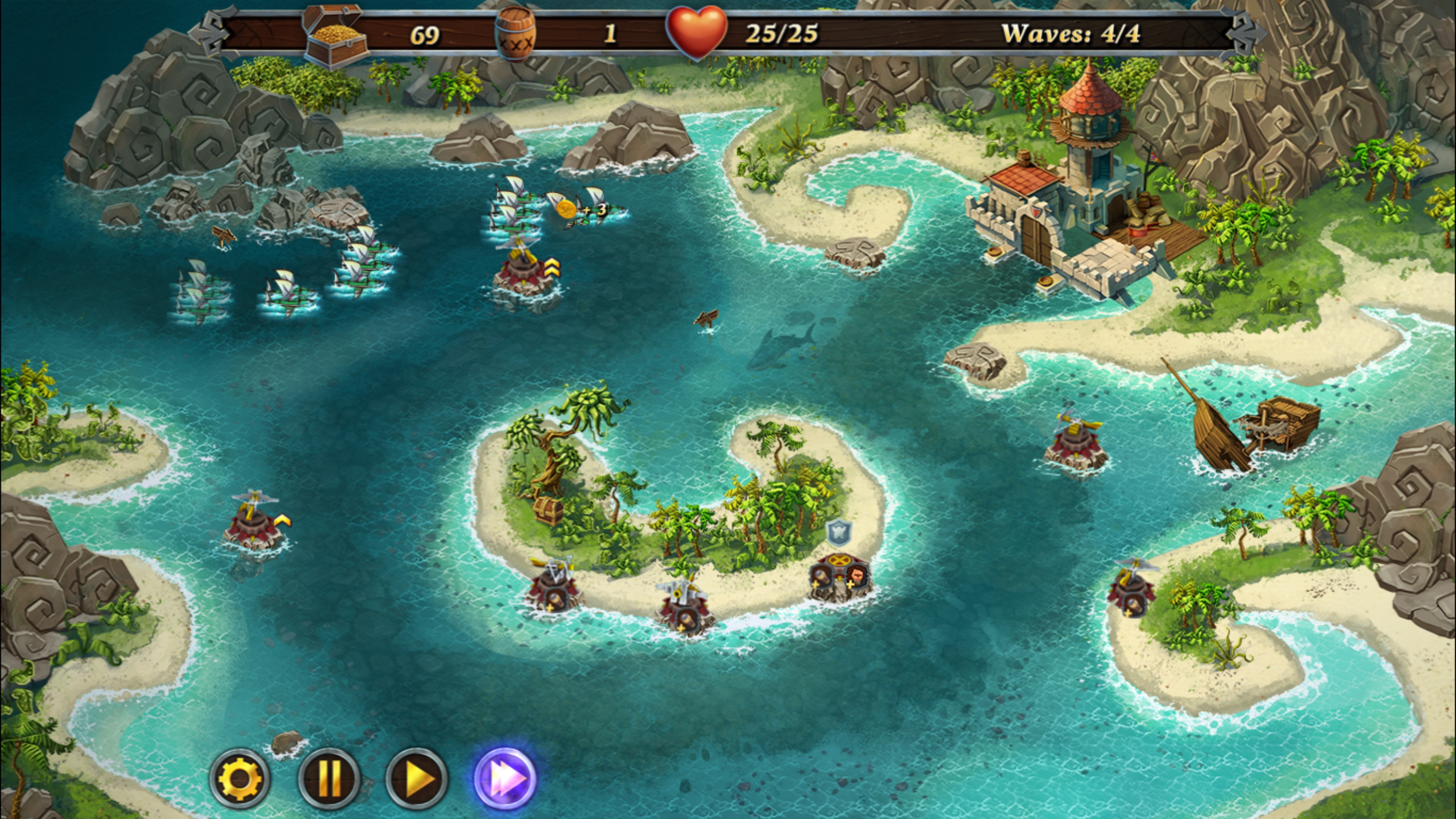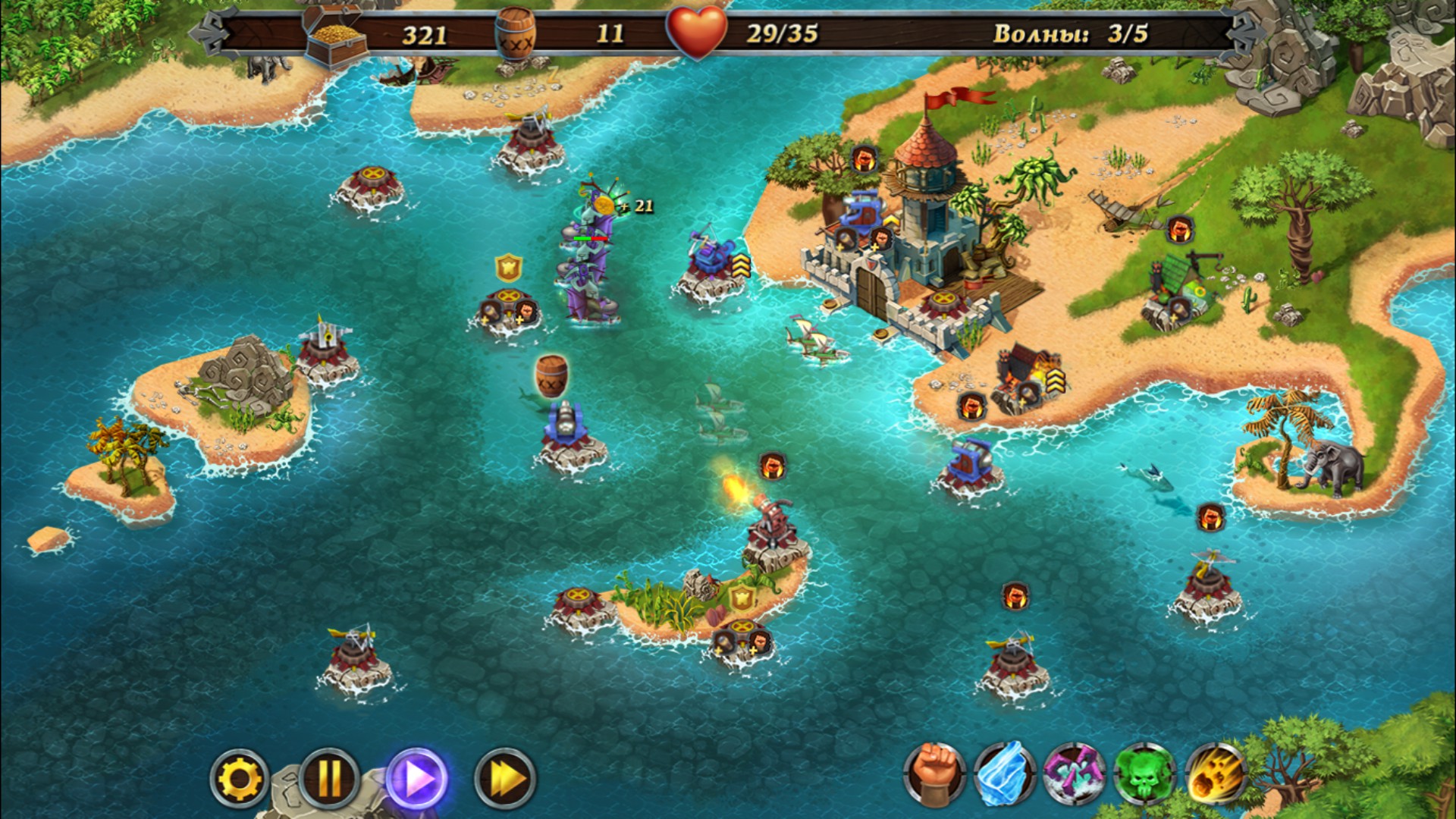 All hands on deck! Pirate armada dead ahead! Take part in an uncompromising struggle repelling freebooters' assaults. Watch out, the enemy may catch the tide for ruining your fortress. Build towers, collect crystals, upgrade spells and believe in your victory!