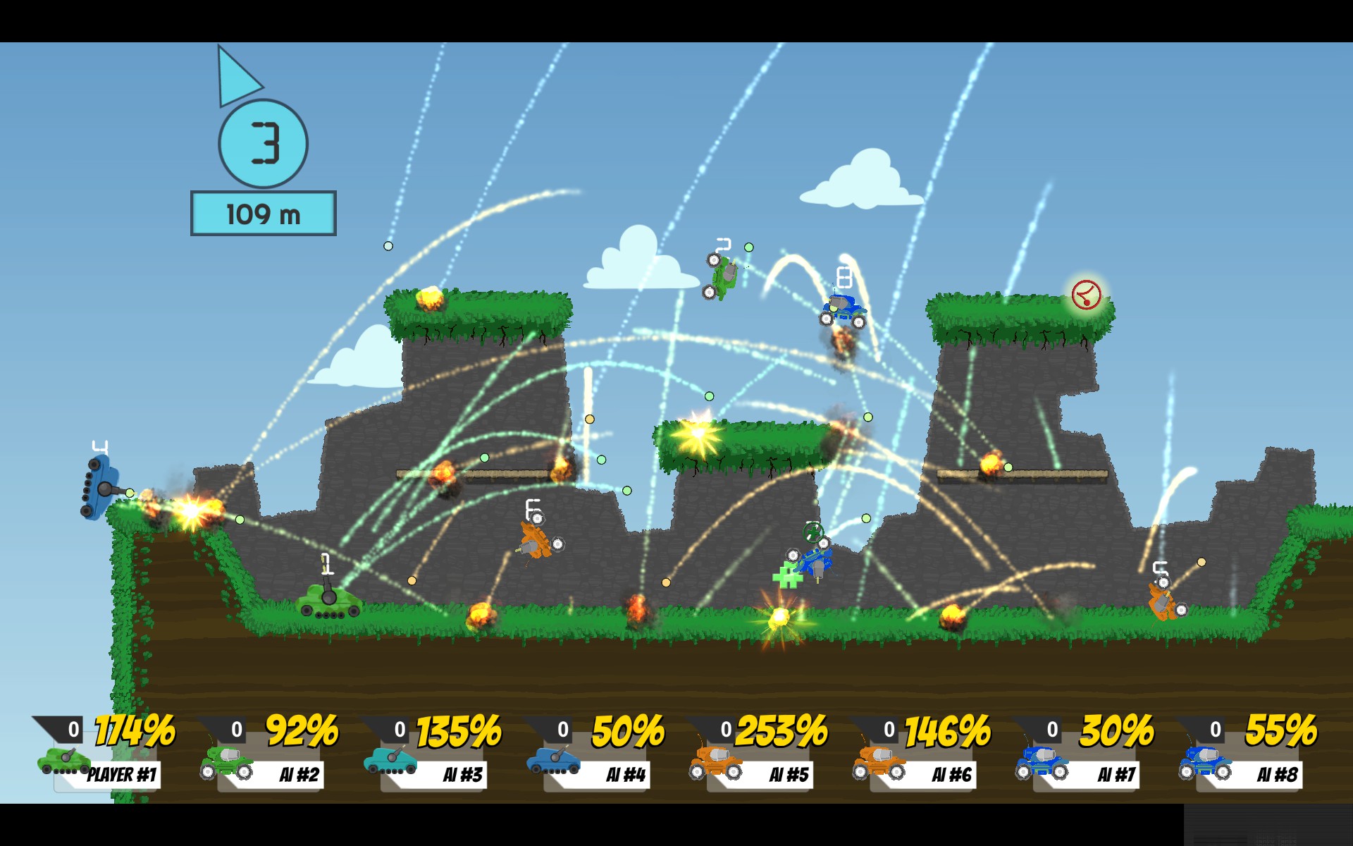 Janky Tanks is a local multiplayer combat game for 1-8 players. It features hilarious physics and rapid "janky" combat. Seriously, your tank winds up spending most of its time in the air, using wall jumps and rocket jumps to fight. It's fun for the whole family. Try it. You won't be disappoint.