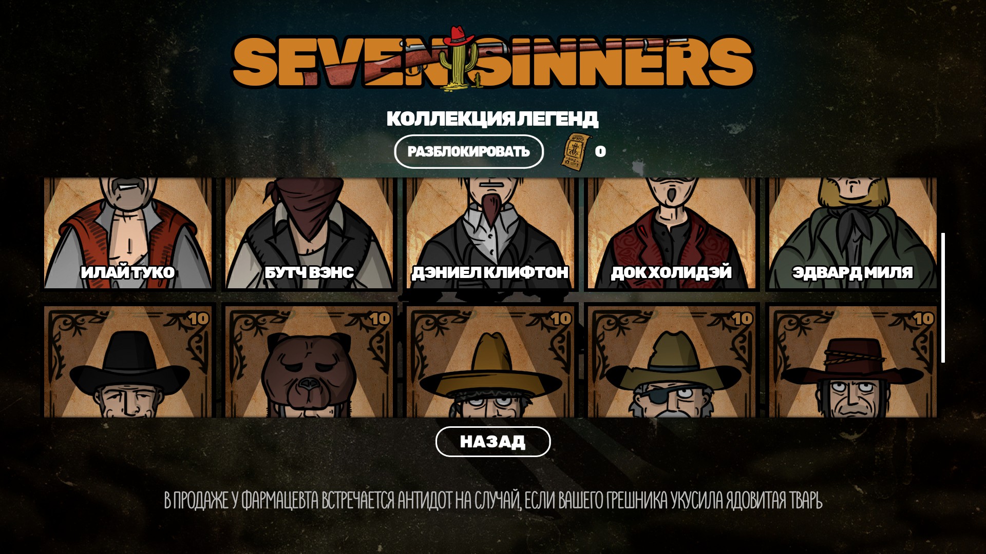 Seven Sinners is a western roguelike with turn-based QTE combat. Guide a band of outlaws from the Wild West. Recruit new sinners into your gang, rob stagecoaches and banks, roam the prairies, and evade the sheriff and his hounds. Will you get rich or will you disappear in the prairies?