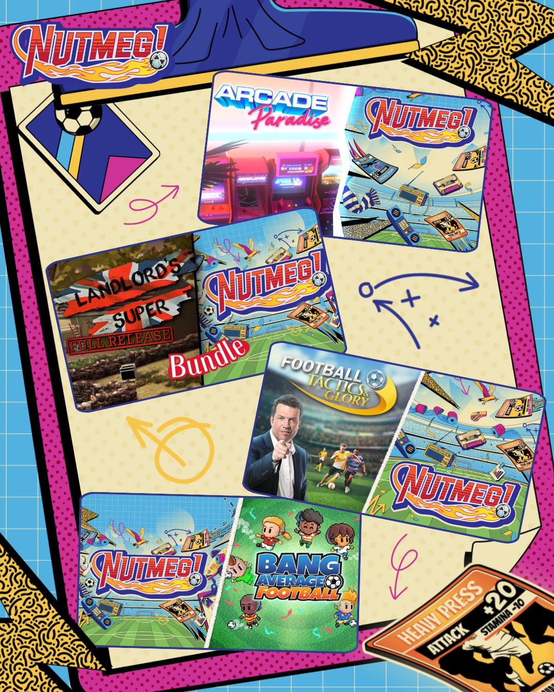 NUTMEG! is a nostalgic football manager game with a deckbuilding twist, set in the '80s and '90s. Relive the days when the tackles were as hard as the mullets were long and football was about football.