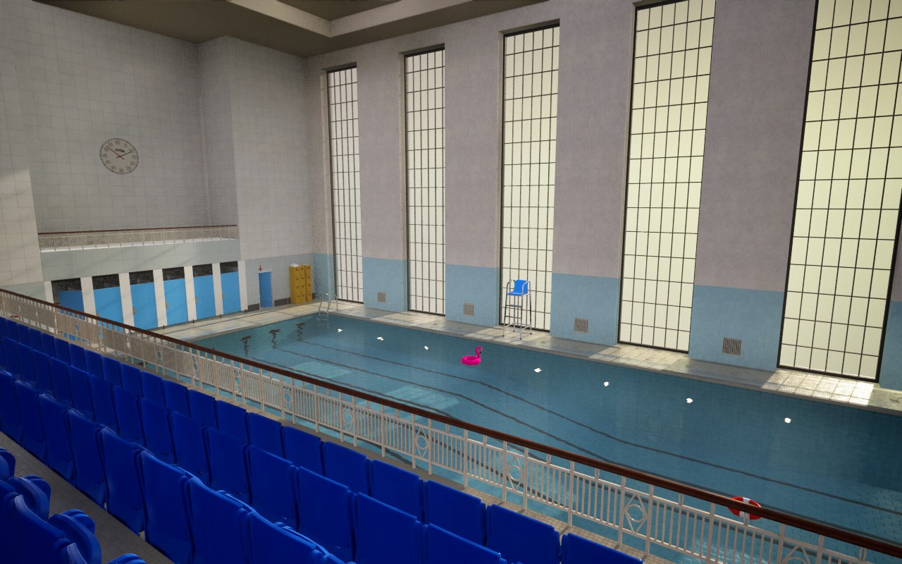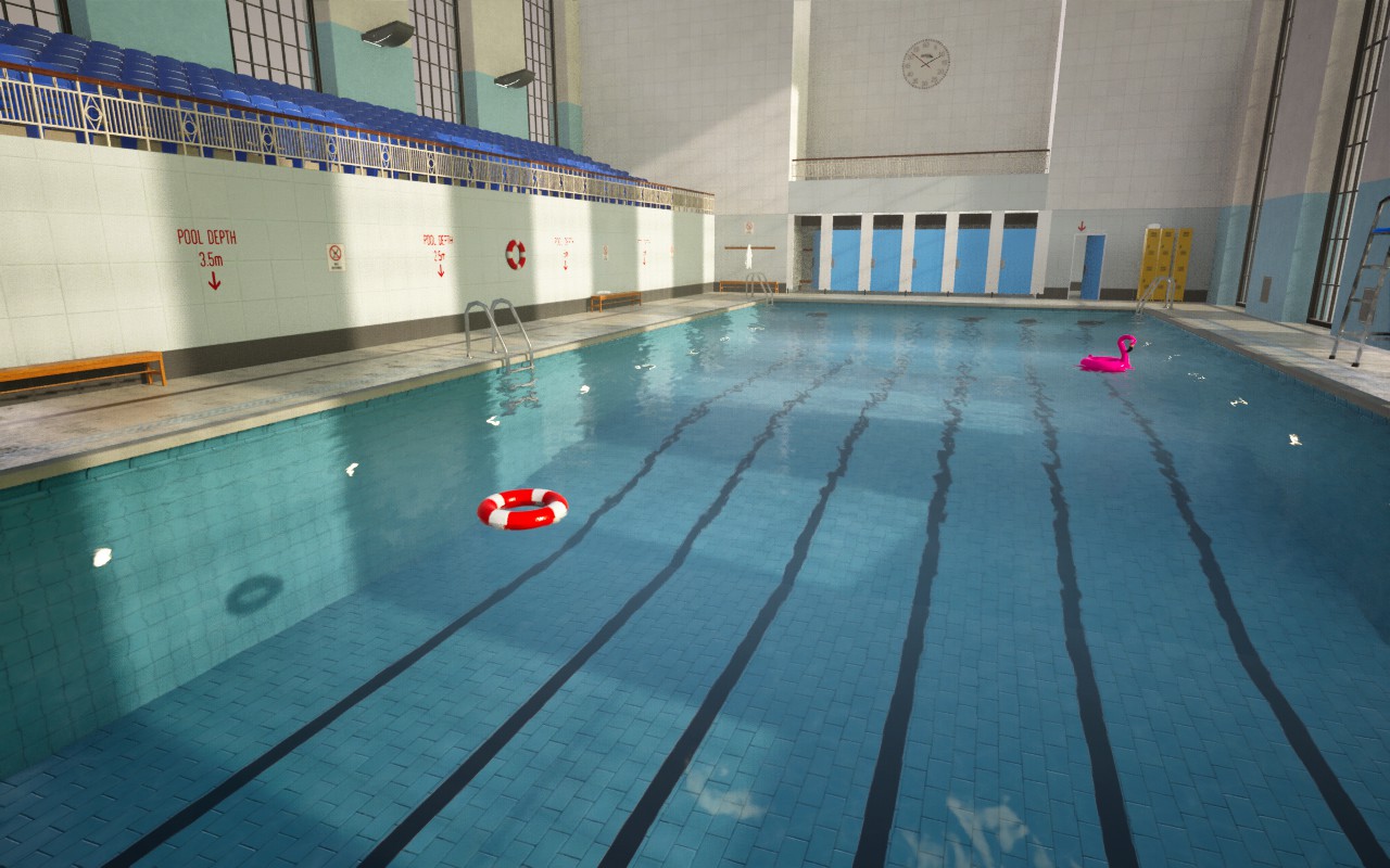 You are trapped in a mysterious swimming pool. Observe the surroundings for any abnormalities and find a way to escape.