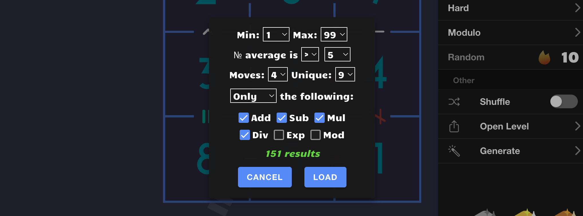 Equate 8 is an innovative and addicting new math puzzle game by the creator of The Devil's Calculator. Rearrange numbers in a 3x3 grid to solve eight equations (3 across, 3 down, and 2 diagonal) in the fewest moves possible. Challenges involve a variety of operators and difficulty levels!