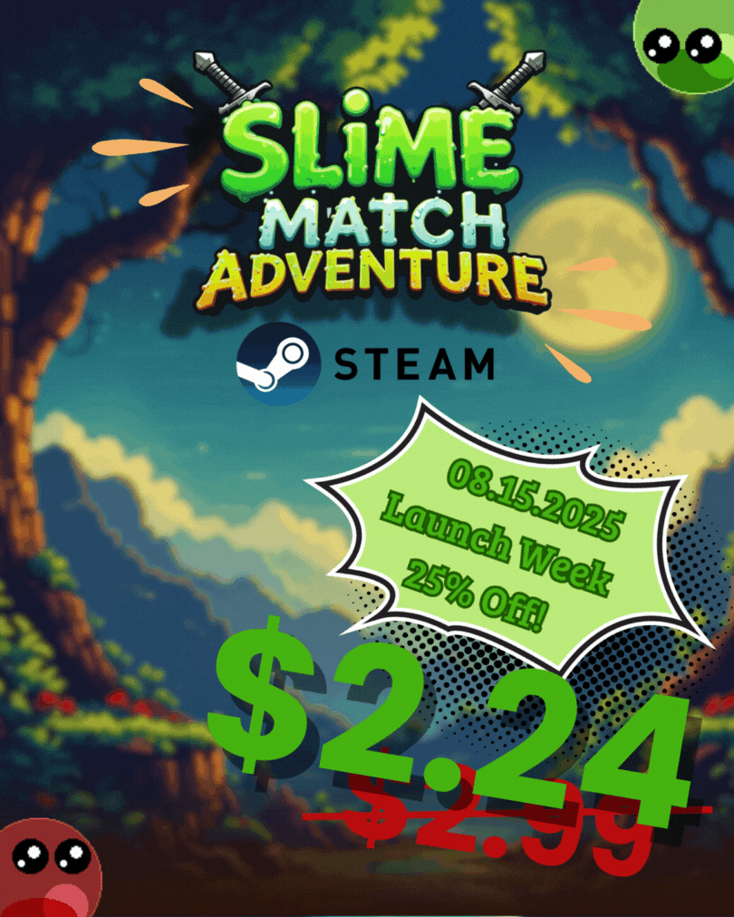 A colorful match-3 roguelite where you collect mana from slimes to cast spells, battle unique bosses, unlock power-ups, and adapt your strategy run after run.