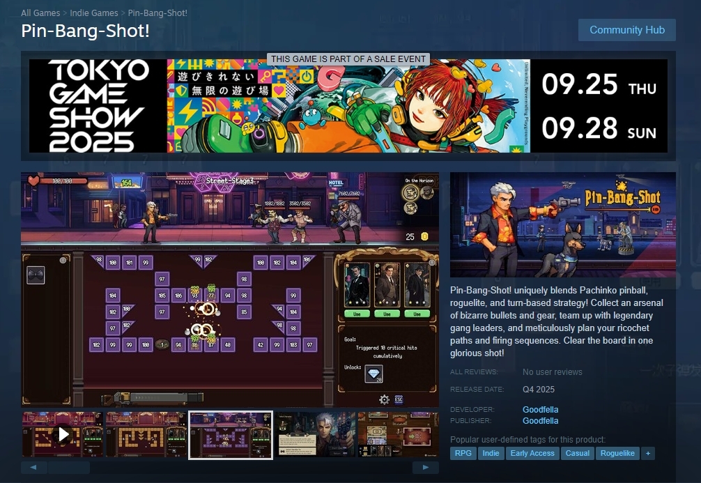 Pin-Bang-Shot! uniquely blends Pachinko pinball, roguelite, and turn-based strategy! Collect an arsenal of bizarre bullets and gear, team up with legendary gang leaders, and meticulously plan your ricochet paths and firing sequences. Clear the board in one glorious shot!