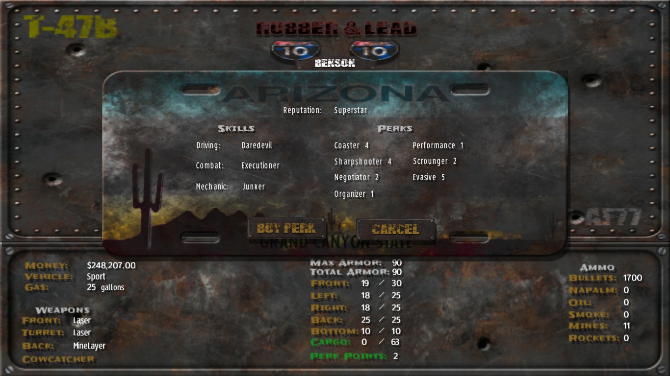 Rubber & Lead is a 2D Top Down Vehicle Combat RPG- Shoot your way through post-apocalyptic Arizona. Go on missions, upgrade your cars, equip your weapons, and blast away your enemies!