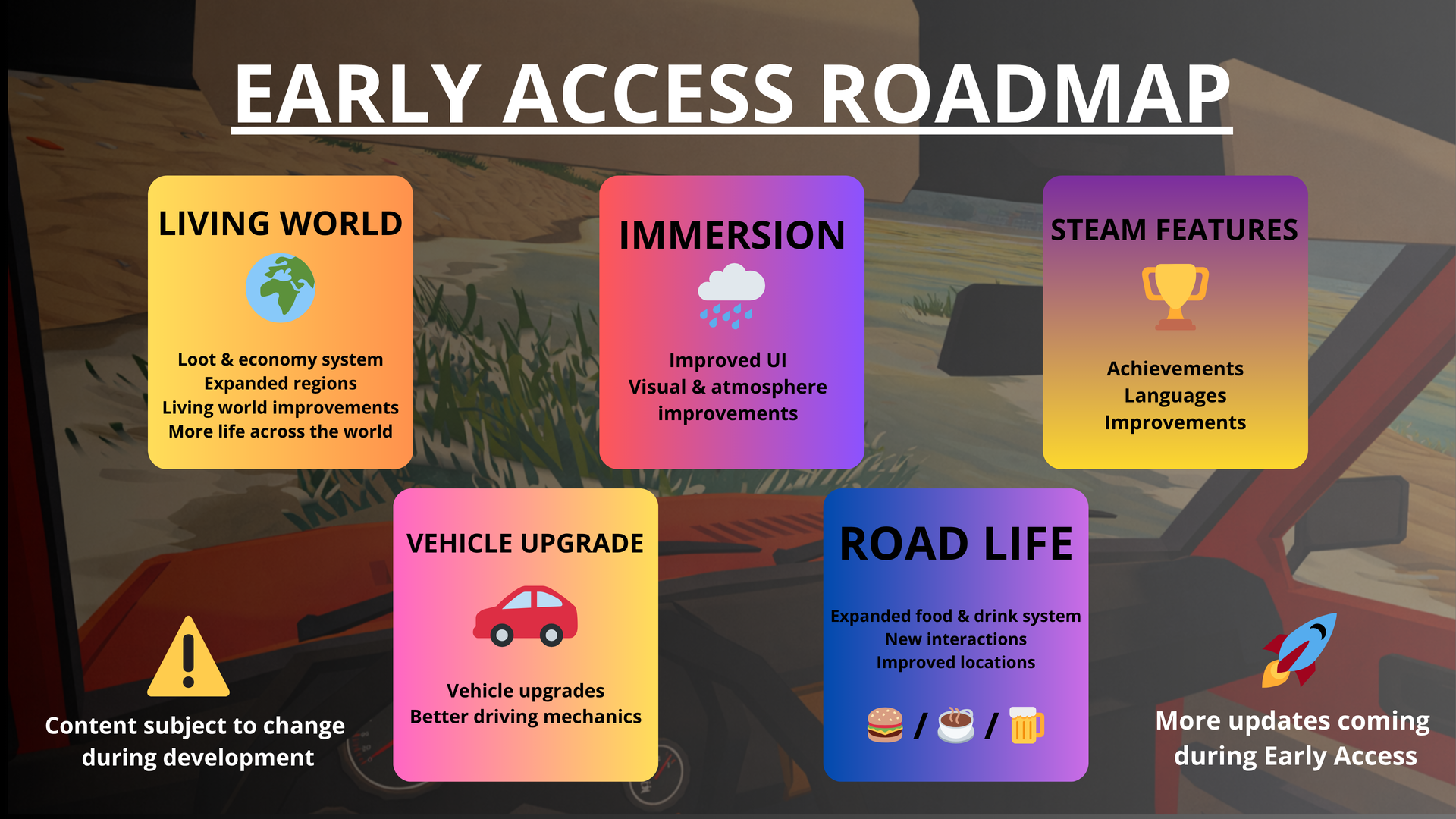 A first-person road trip simulator where you drive, repair and maintain your car, explore open roads, take on small jobs and travel across a vast open world at your own pace.