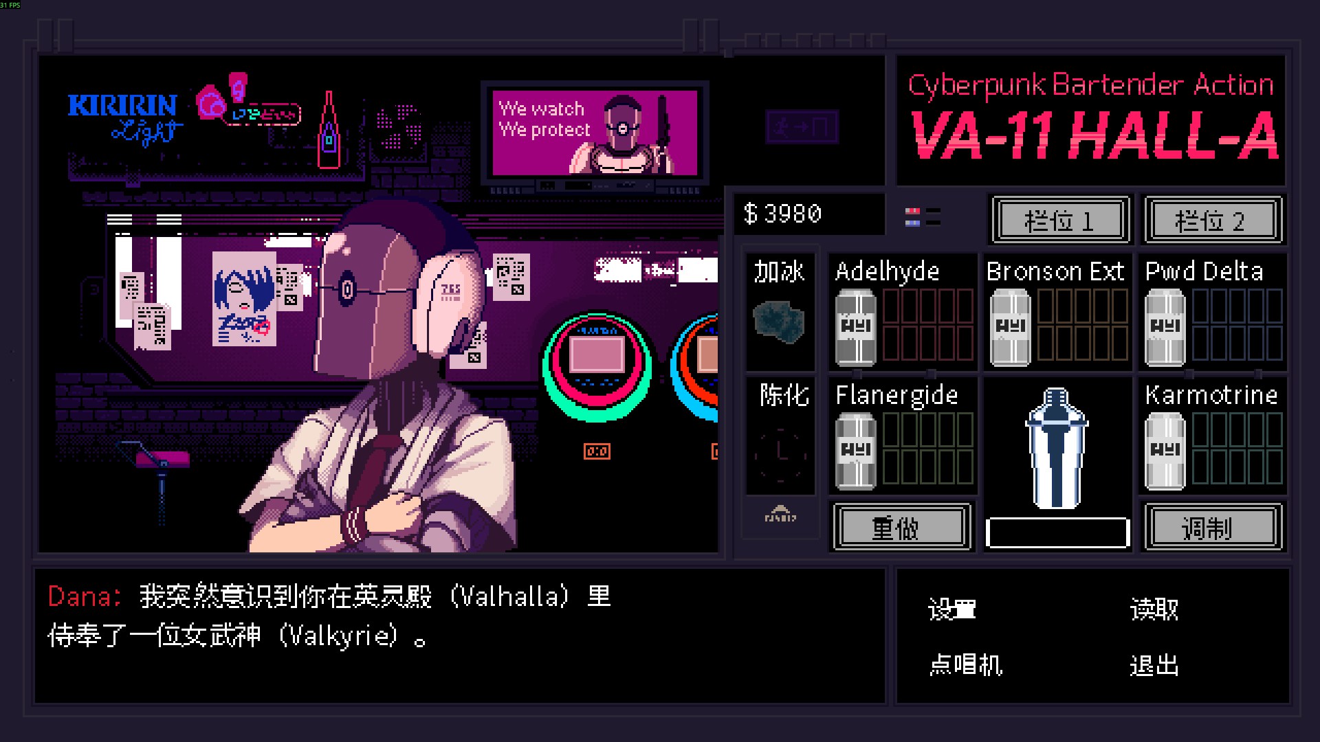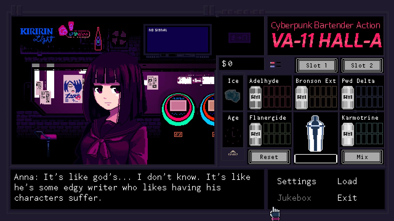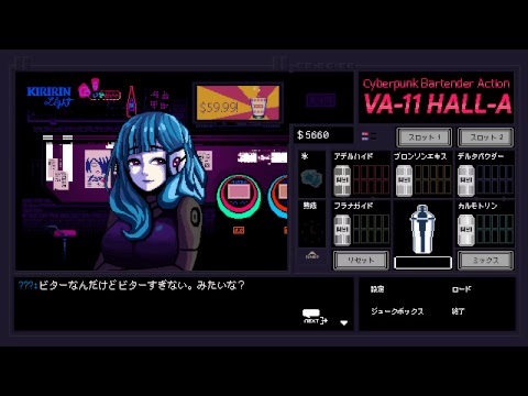 VA-11 HALL-A: Cyberpunk Bartender Action is a booze em' up about waifus, technology, and post-dystopia life.