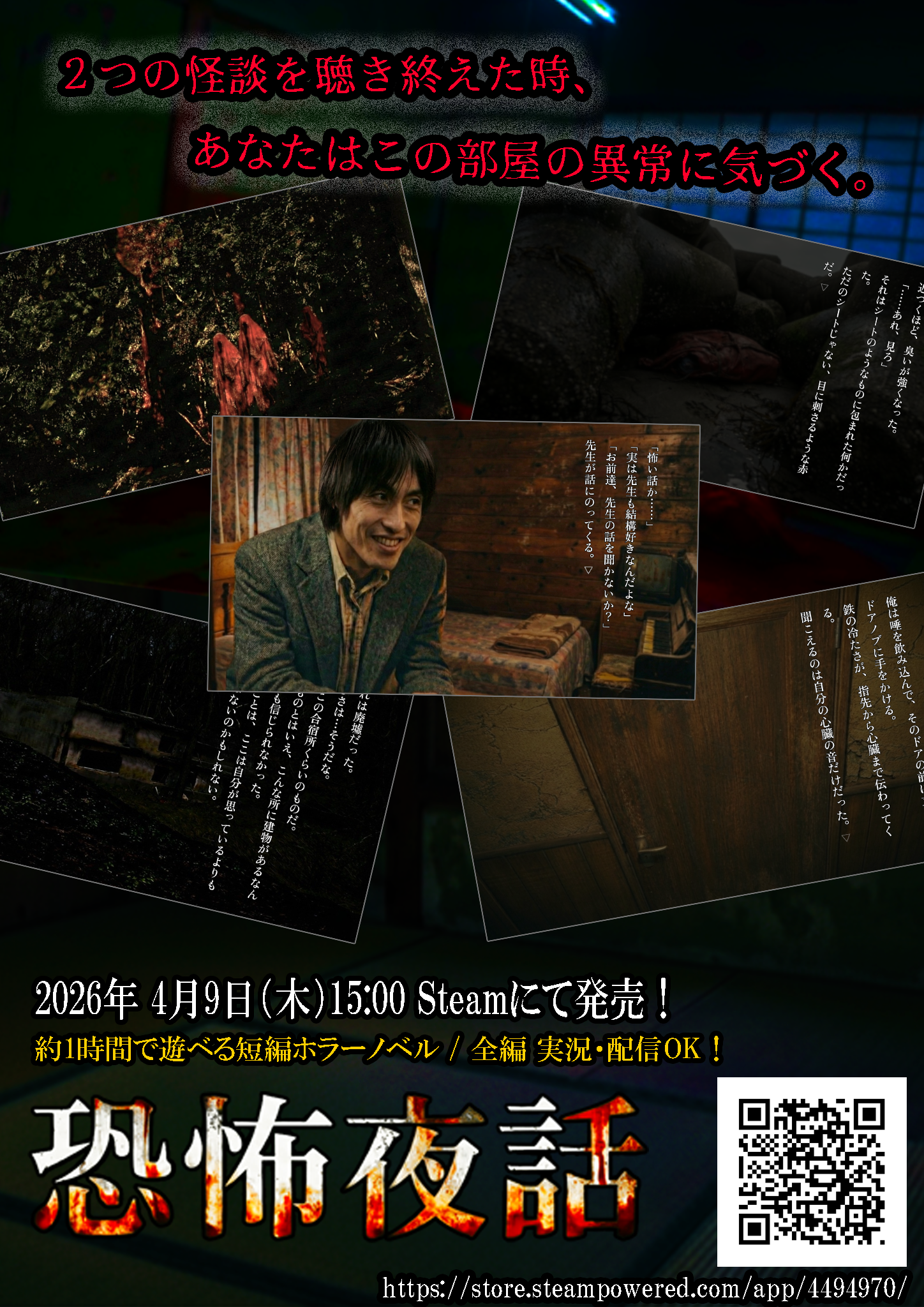 Late at night, a teacher shares two bizarre tales: a corpse stuffed in a sheet, and an abnormal presence in the mountains. It was just a ghost story, but a creepy "sense of unease" lurks within. A short psychological horror visual novel offering a dense, terrifying experience in about an hour.