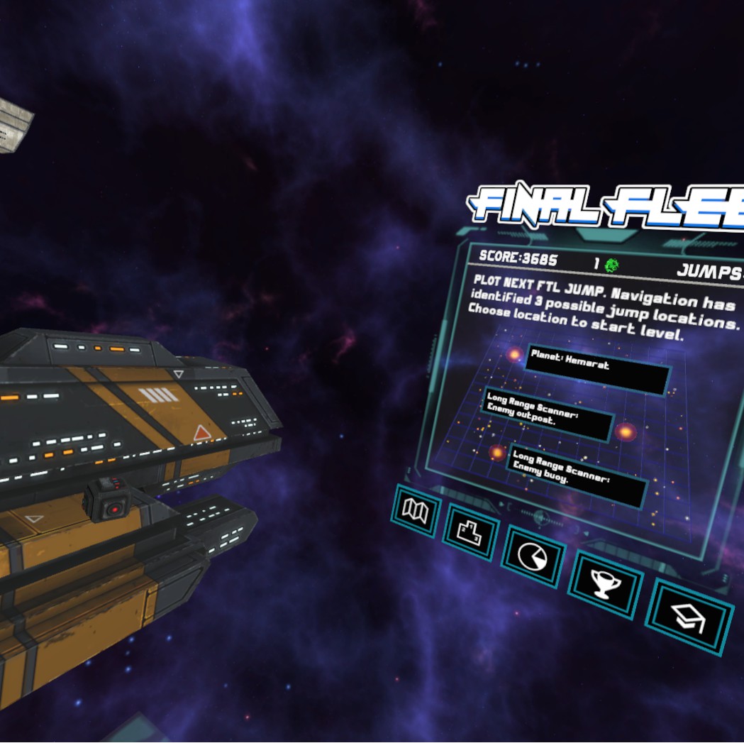 A lone interstellar fleet must travel across a distant and perilous galaxy in the hope of reaching safety. Final Fleet is a Virtual Reality fleet building, space shooter.