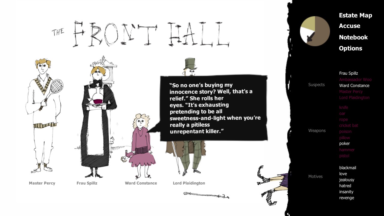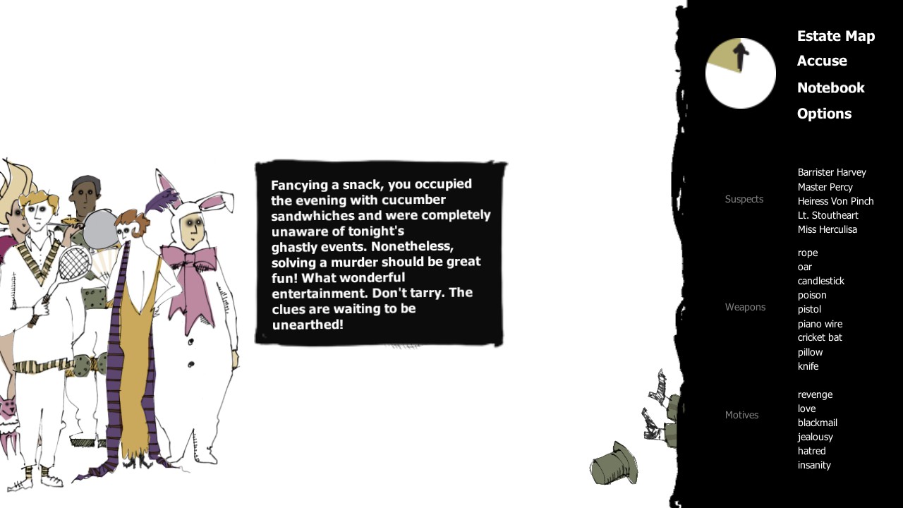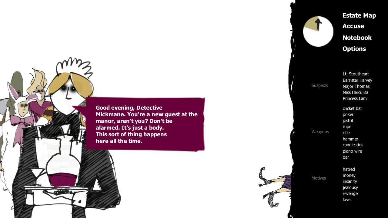A Matter of Murder is a point-and-click puzzle game with rogue-like elements. The details of each murder are procedurally generated, so each case is different every time you play with progressively more challenging logic puzzles.